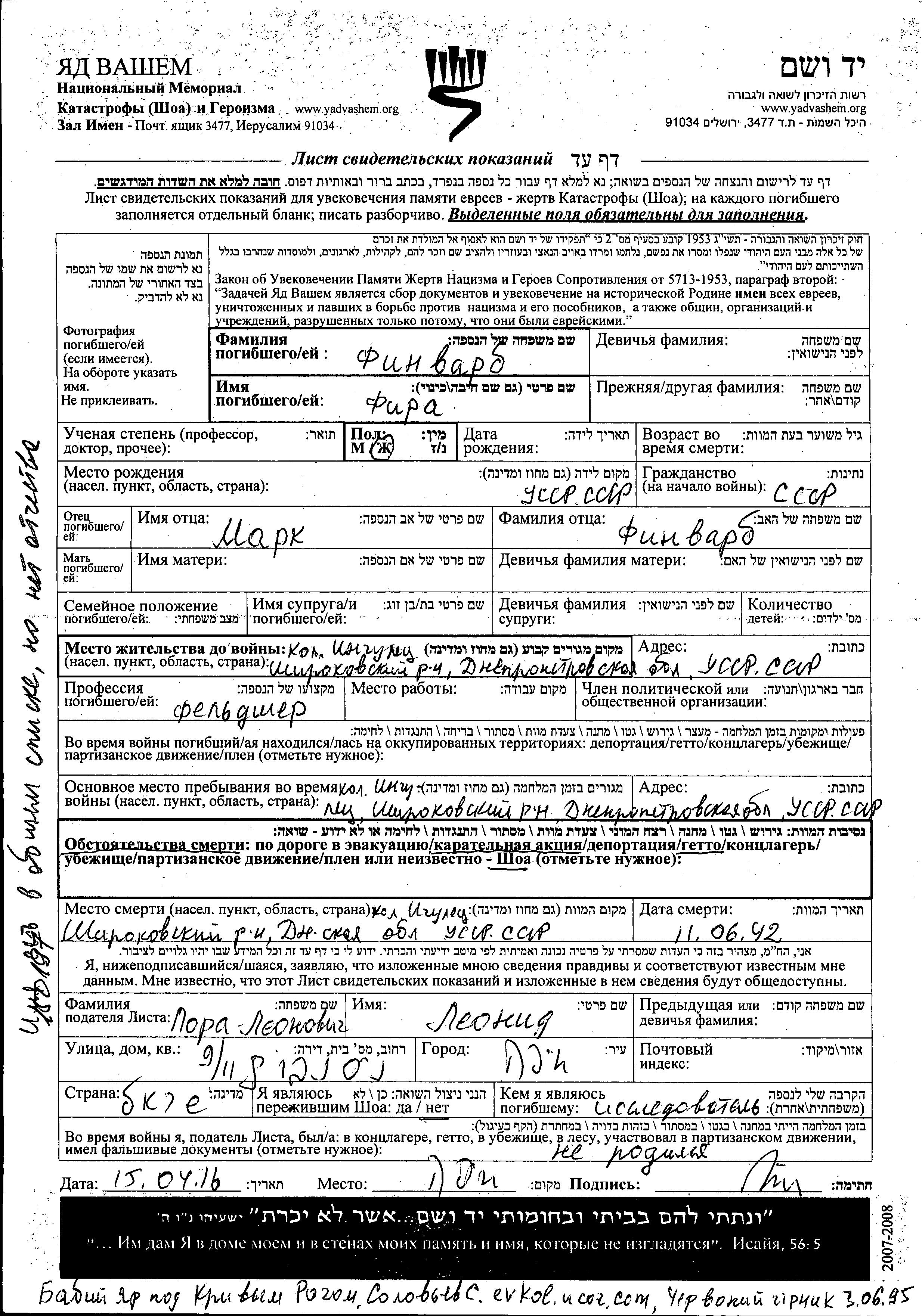Finvarb Fira Ingulets, Ukraine (USSR) Page of Testimony