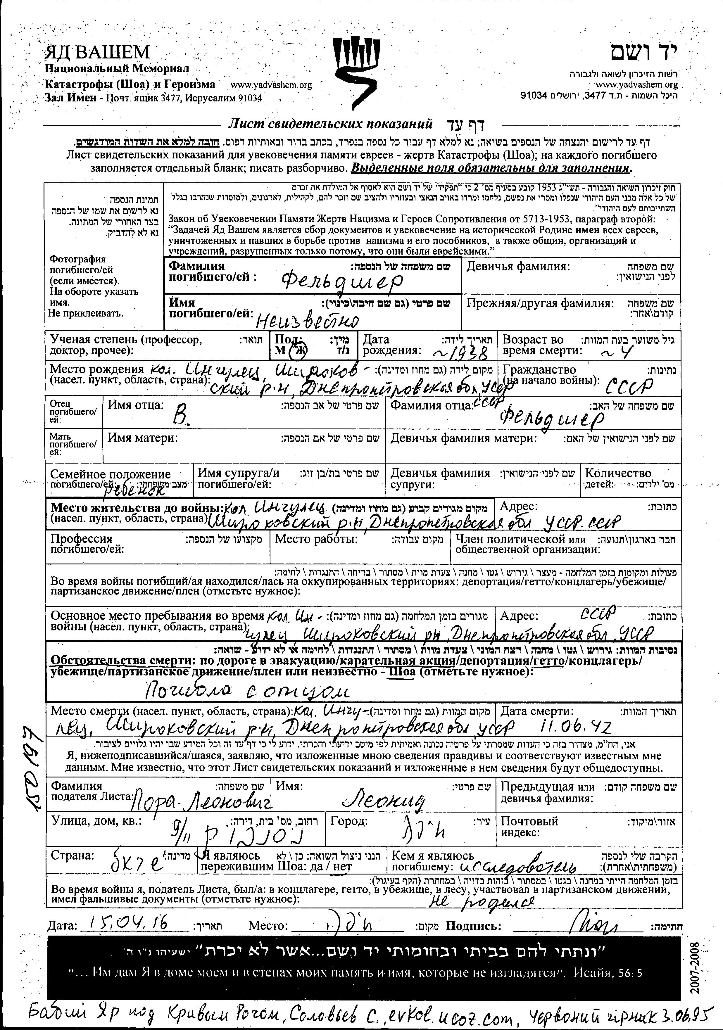 Feldsher First name unknown 1938 Ingulets, Ukraine (USSR) Page of Testimony