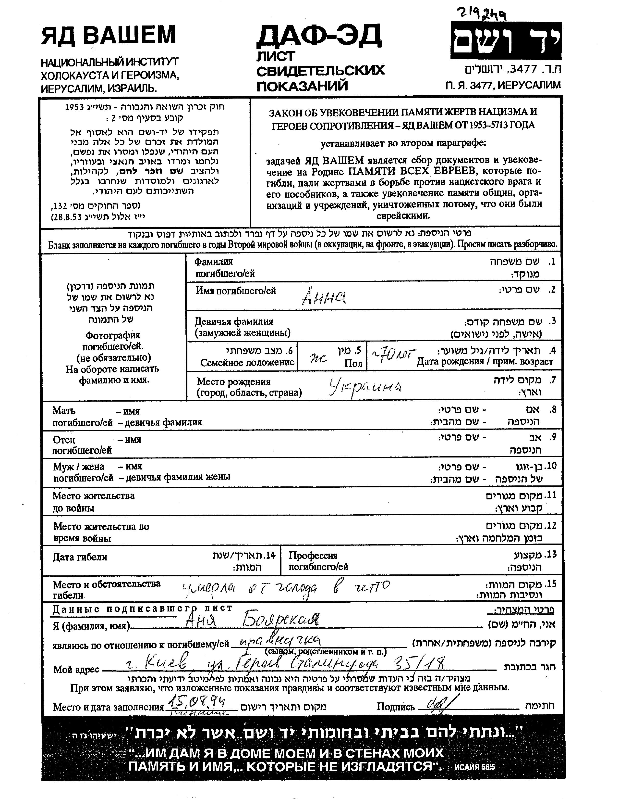 Yad Vashem - Pages of Testimony Names Memorial Collection