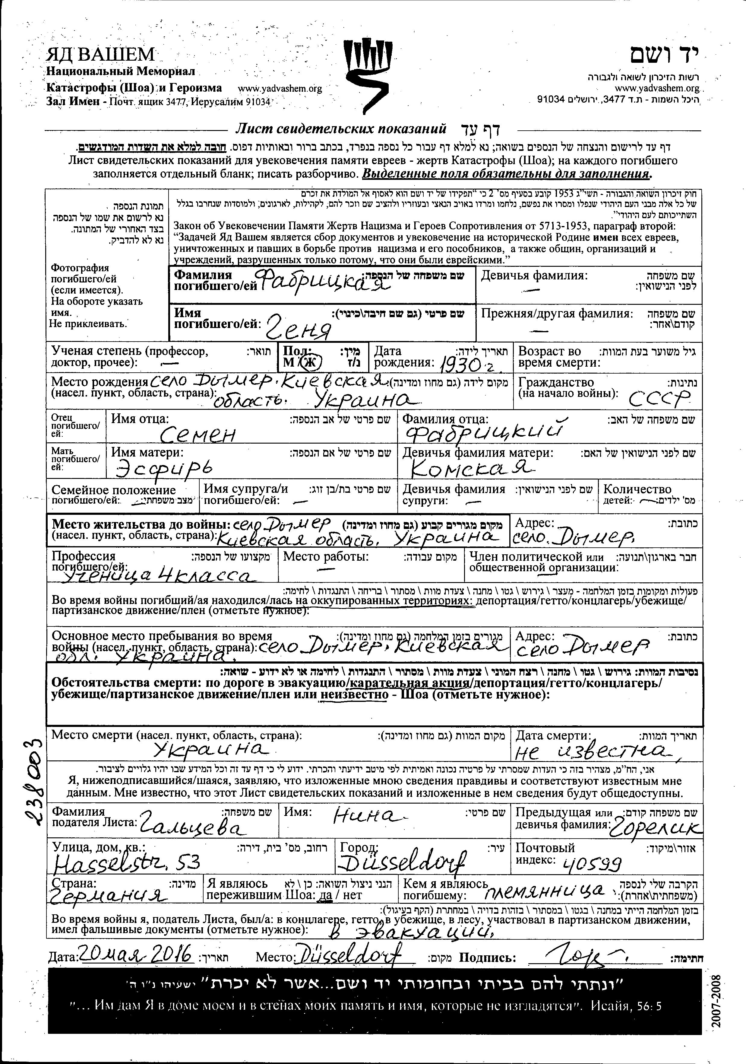 Genya Fabritzkaya was born in Dymer, Ukraine (USSR), 1930 to Semyon and Esfir nee Komskaya. She was a schoolgirl. Prior to WWII she lived in Dymer, Ukraine (USSR). During the war she was in Dymer, Ukraine (USSR). Genya was murdered in the Shoah. Place of death: Ukraine (USSR).