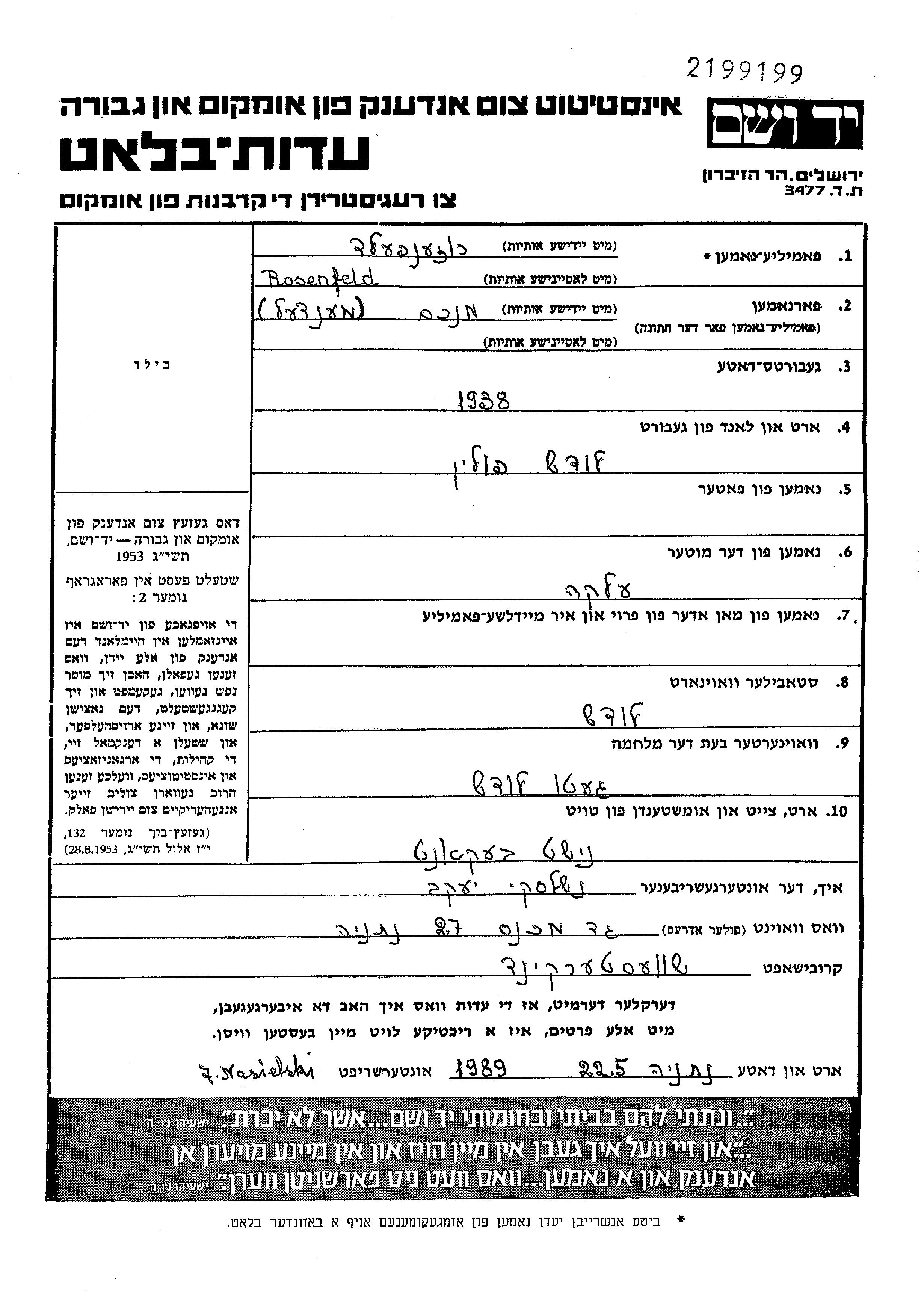 Rosenfeld Mendl Menakhem 1938 Lodz, Poland Page of Testimony
