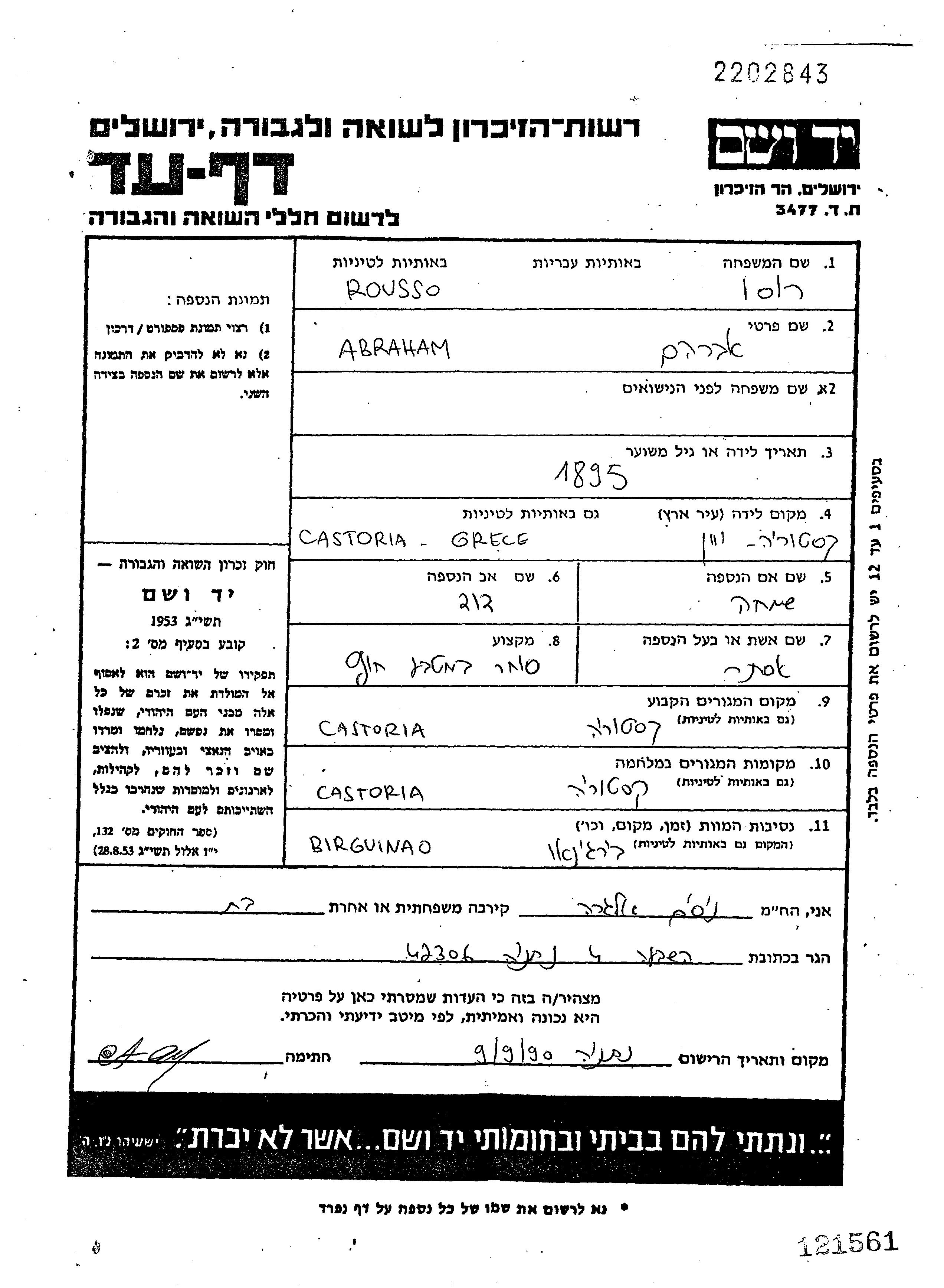 Rousso Abraham 1895 Kastoria, Greece Page of Testimony