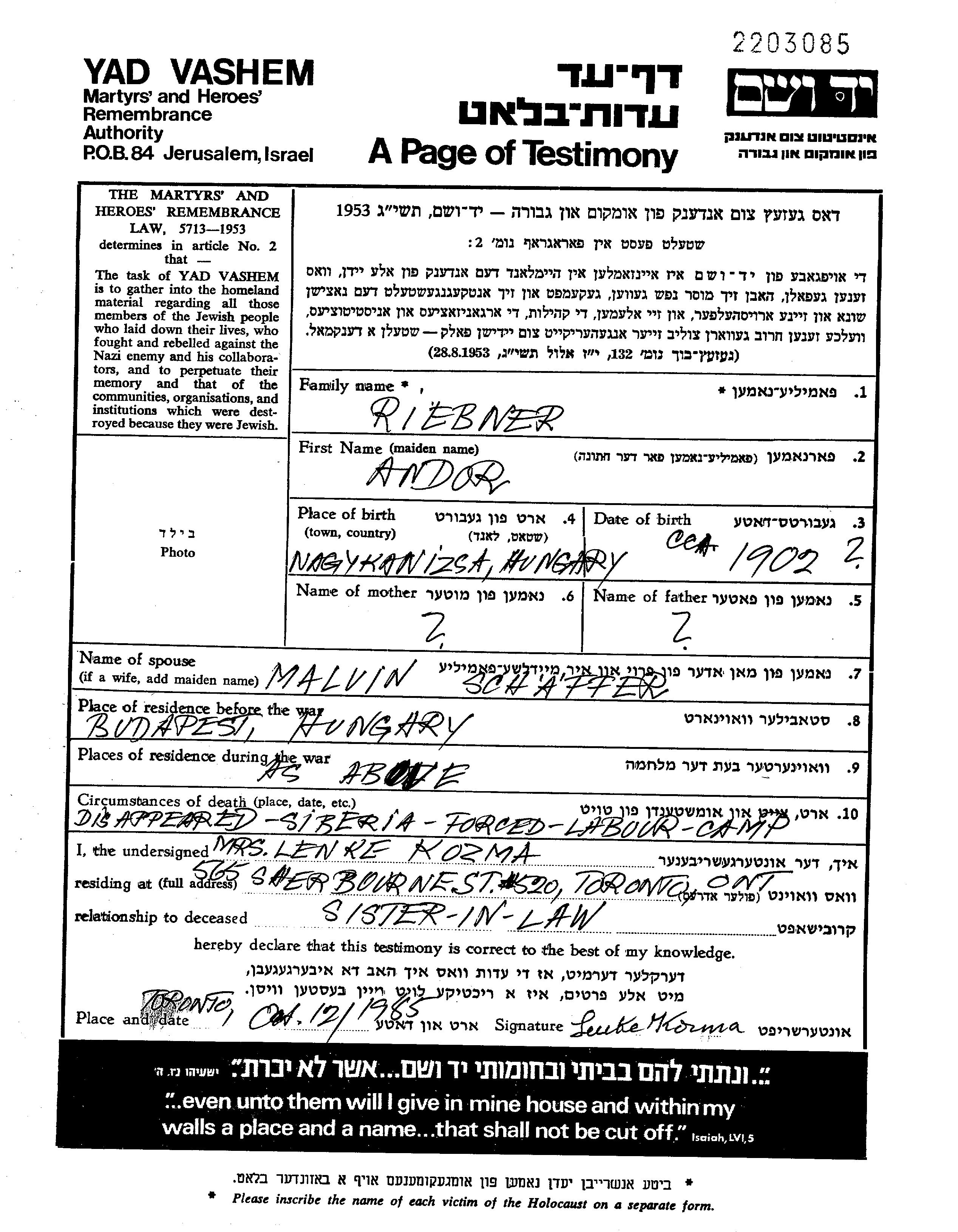 Riebner Andor 1902 Budapest, Hungary Page of Testimony