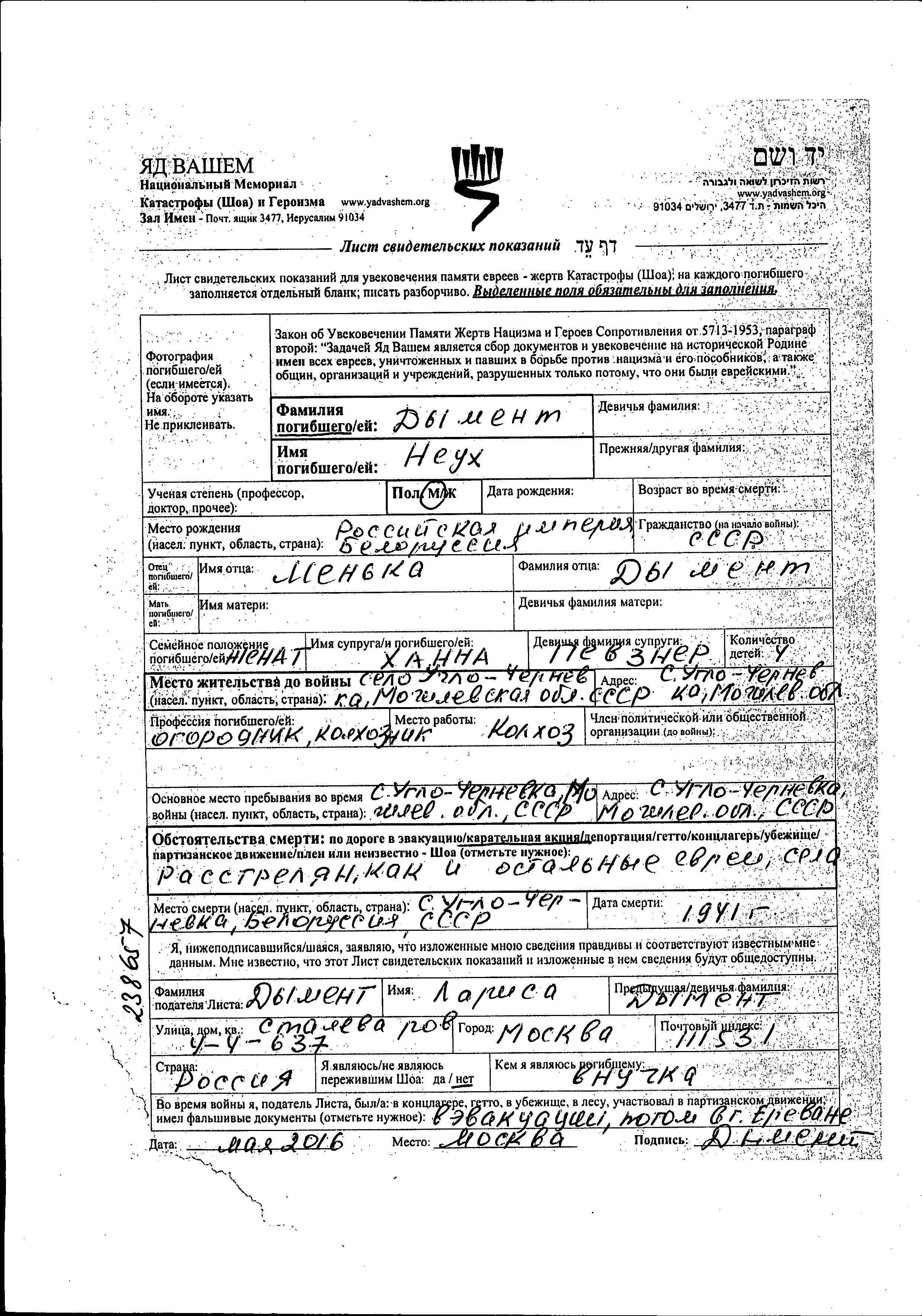 Neukh Dyment was born in Russian Empire to Menka. He was a kolkhoznik / kolkhoznitza and married to Khanna nee Pevzner. Prior to WWII he lived in Chernevka, Belorussia (USSR). During the war he was in Chernevka, Belorussia (USSR). Neukh was murdered in the Shoah. Place of death: Chernevka, Belorussia (USSR), 1941.