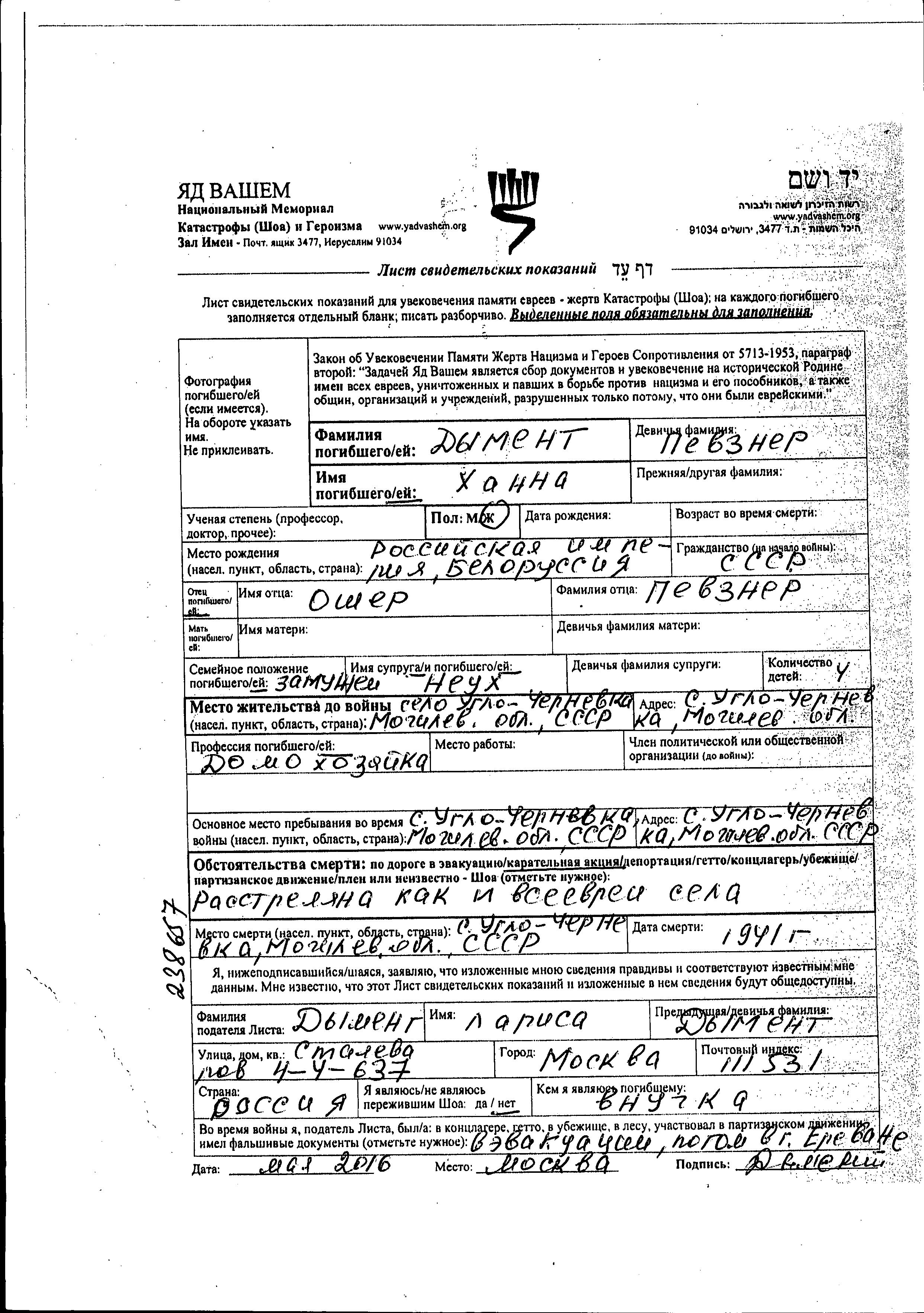 Khanna Dyment nee Pevzner was born in Russian Empire to Osher. She was a housewife and married to Neukh. Prior to WWII she lived in Chernevka, Belorussia (USSR). During the war she was in Chernevka, Belorussia (USSR). Khanna was murdered in the Shoah. Place of death: Chernevka, Belorussia (USSR), 1941.