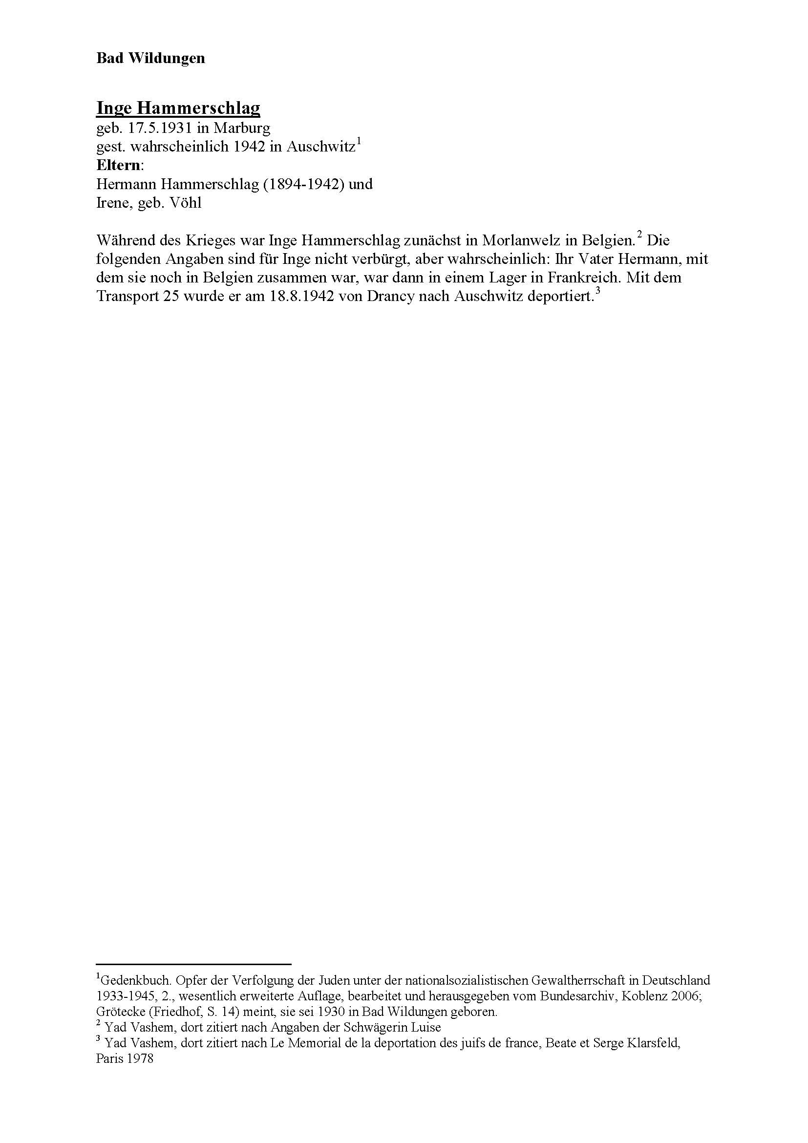 Inge Hammerschlag was born in Marburg, Germany, 1931 to Hermann and Irene nee Voehl. She was child. Prior to WWII she lived in Bad Wildungen, Germany. During the war she was in Morlanwelz, Belgium. Inge was murdered in the Shoah. Place of death: Auschwitz, Poland, 1942.
