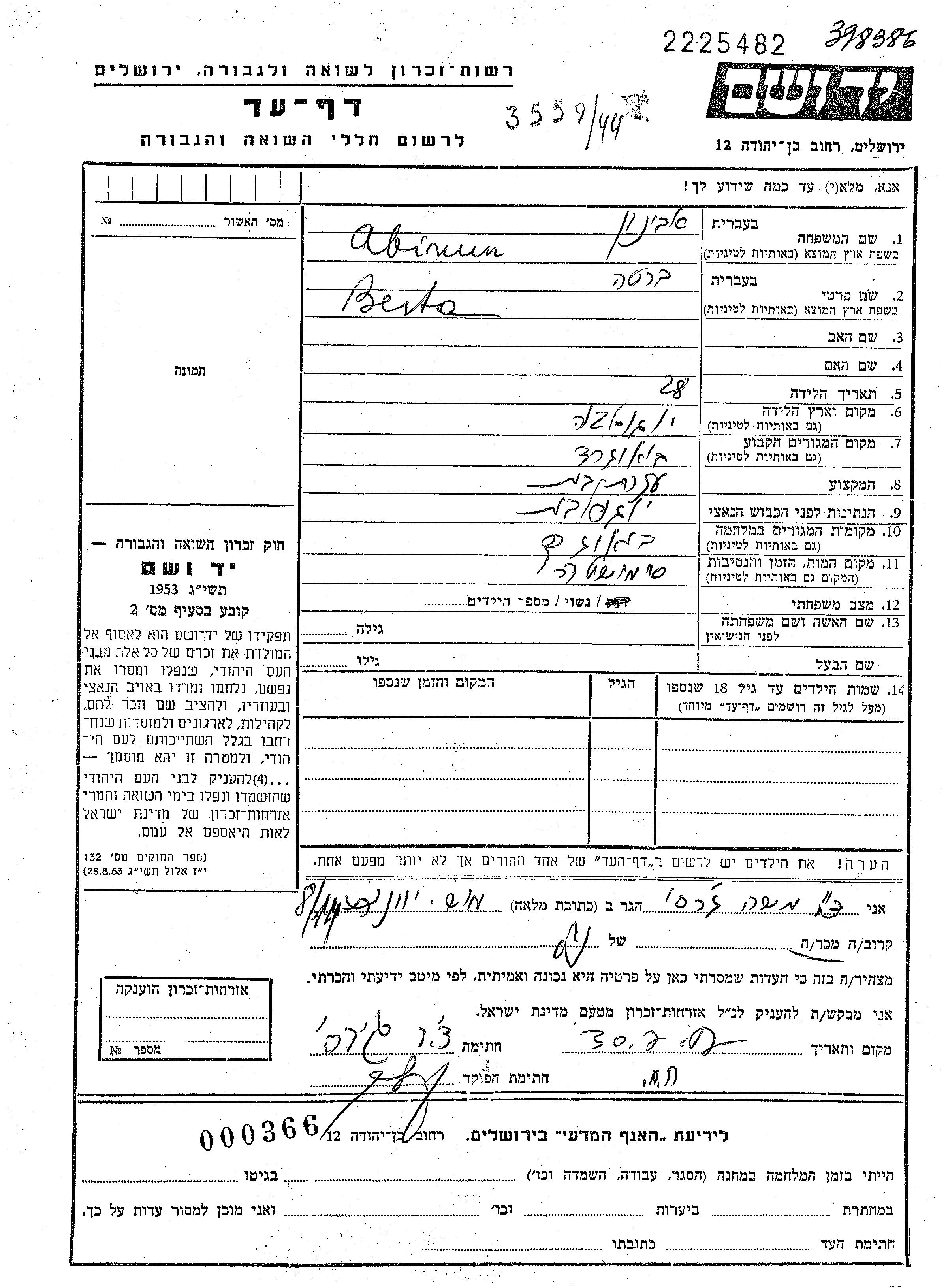 Abinun Berta Beograd, Yugoslavia Page of Testimony