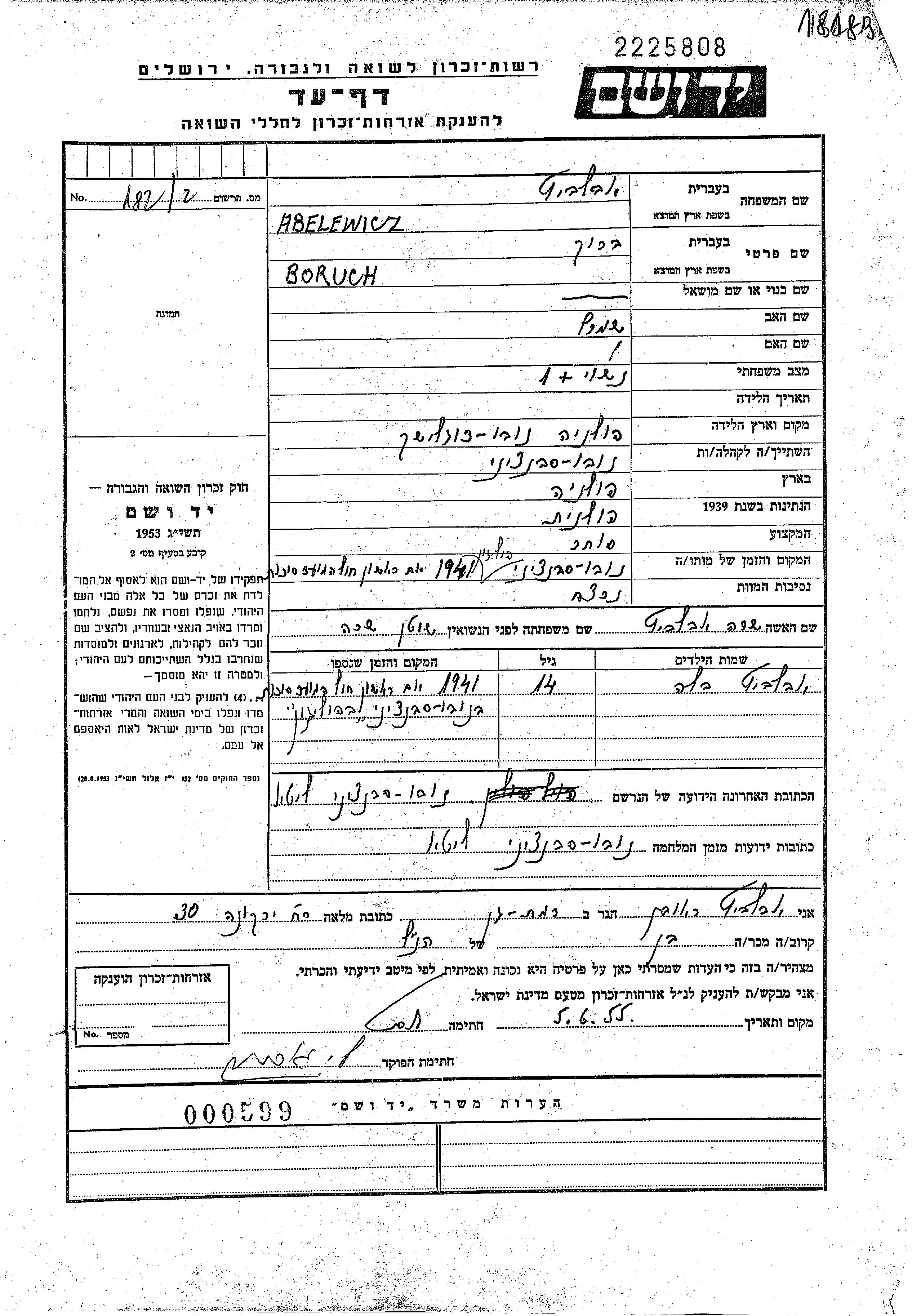 Boruch Abelewicz was born in Kowaliszki, Poland to Shmerl. He was a merchant and married to Sara. Prior to WWII he lived in Nowo Swieciany, Poland. During the war he was in Nowo Swieciany, Poland.