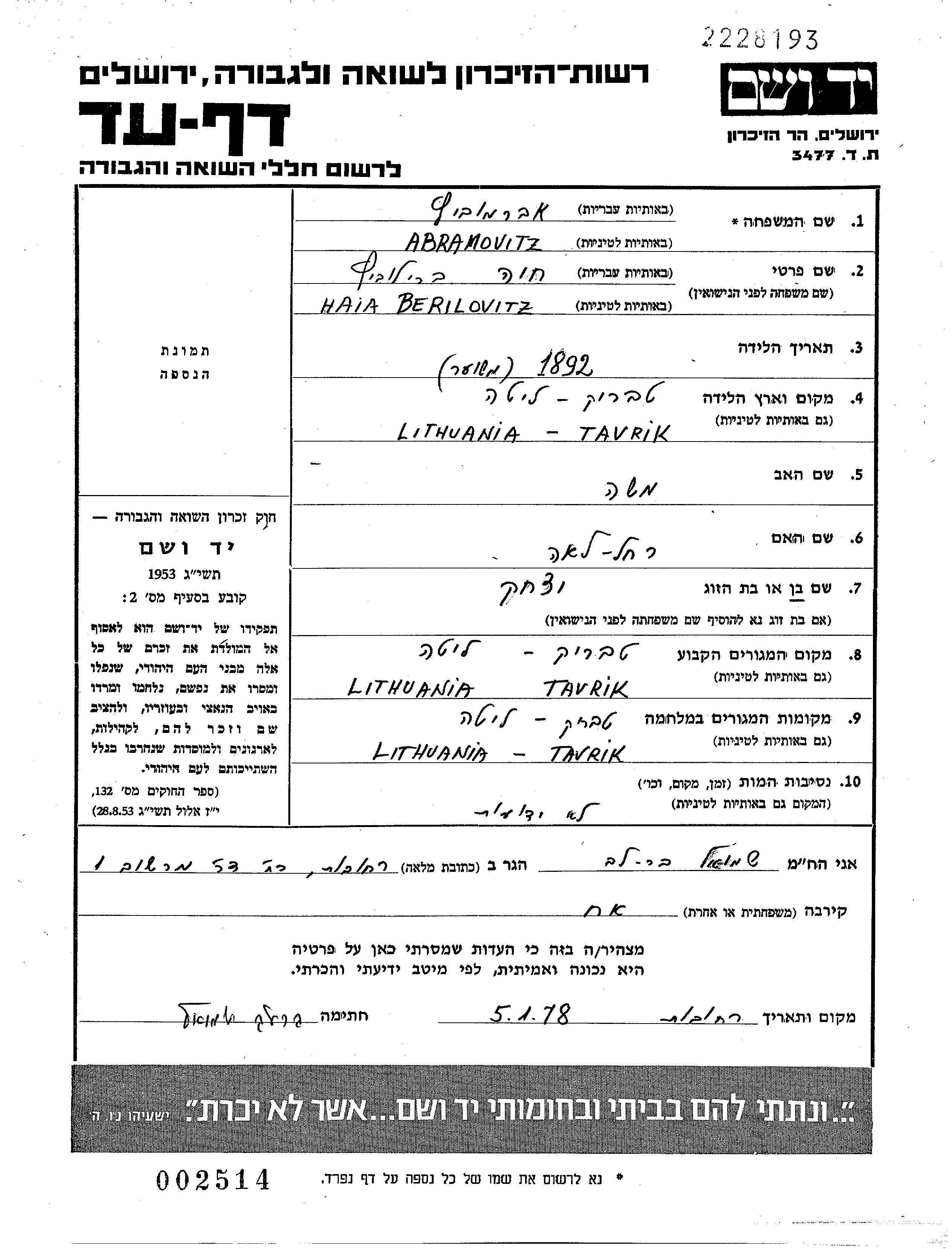 Haia Abramovitz nee Berilovitz was born in Tavrik, Lithuania, 1892 to Moshe and Rakhel Lea. She was married to Itzhak. Prior to WWII she lived in Tavrik, Lithuania. During the war she was in Tavrik, Lithuania.