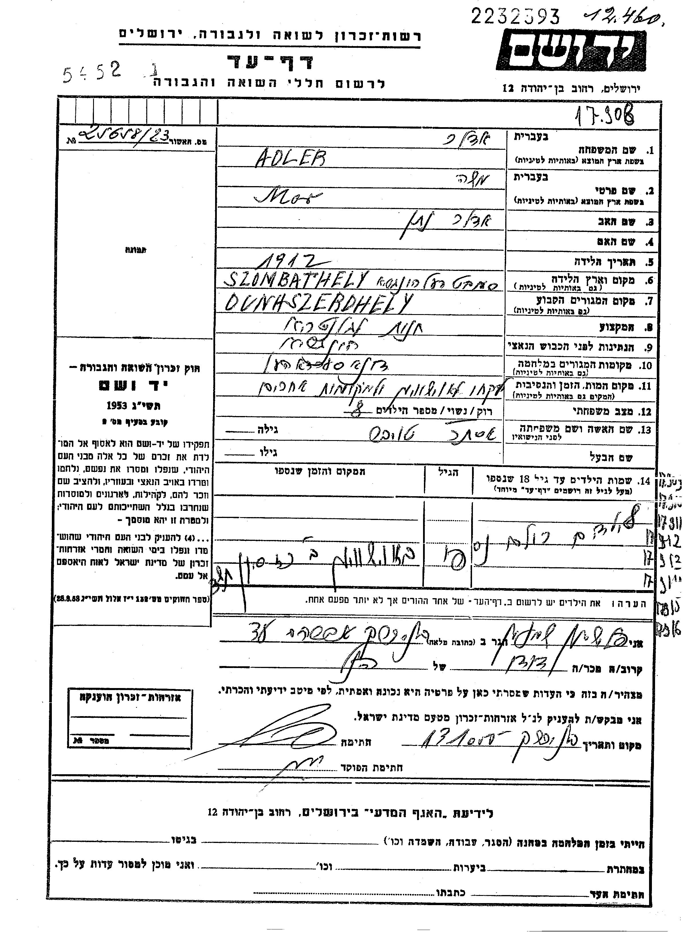 Mor Moshe Adler was born in Szombathely, Hungary, 1912 to Natan. He was a shop owner and married to Ester. Prior to WWII he lived in Dunaszerdahely, Czechoslovakia. During the war he was in Dunaszerdahely, Czechoslovakia.