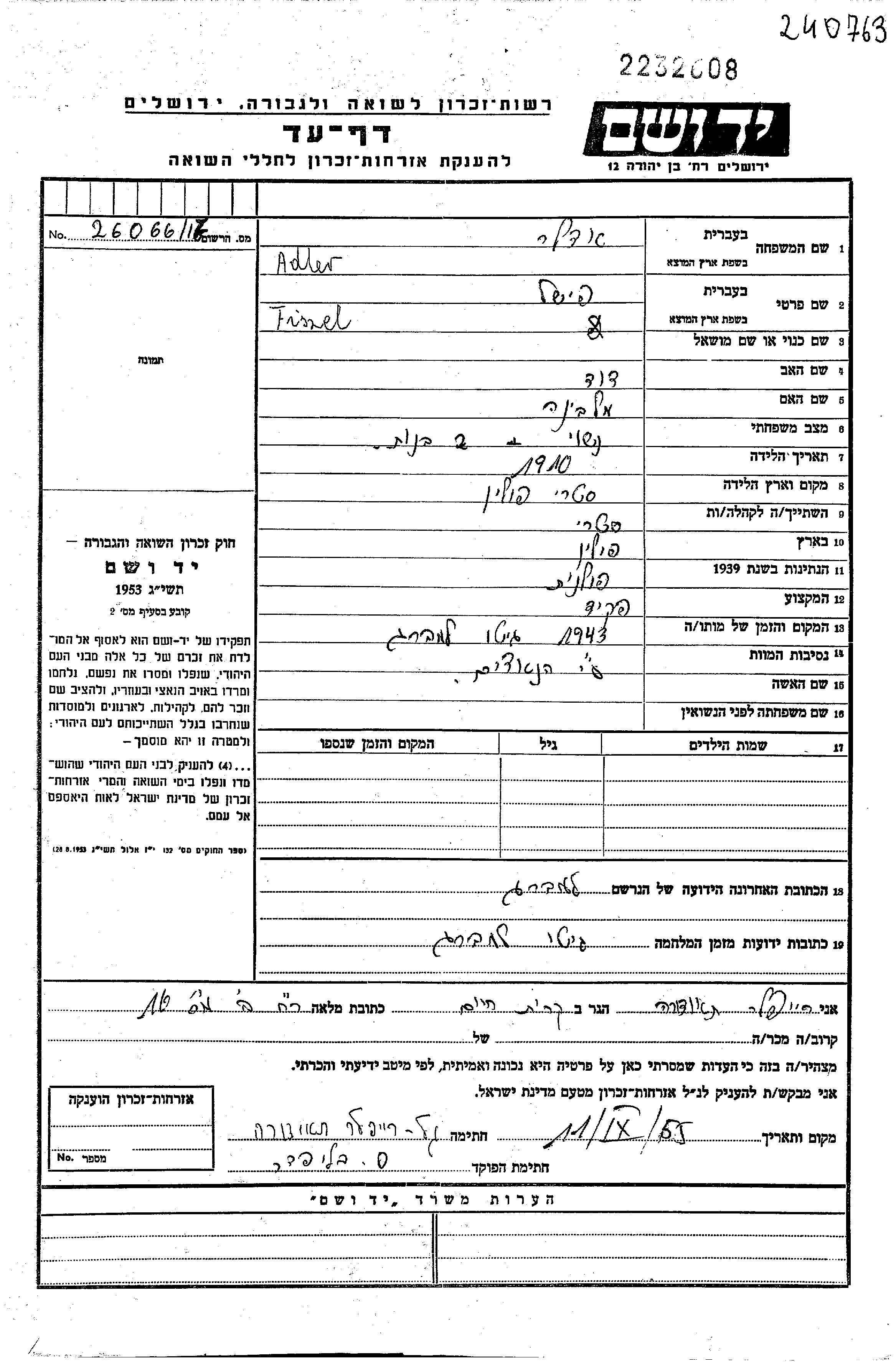 Fiszel Adler was born in Stryj, Poland, 1910 to David and Malvina. He was a clerk and married. Prior to WWII he lived in Lemberg, Poland. During the war he was in Lemberg, Poland.
