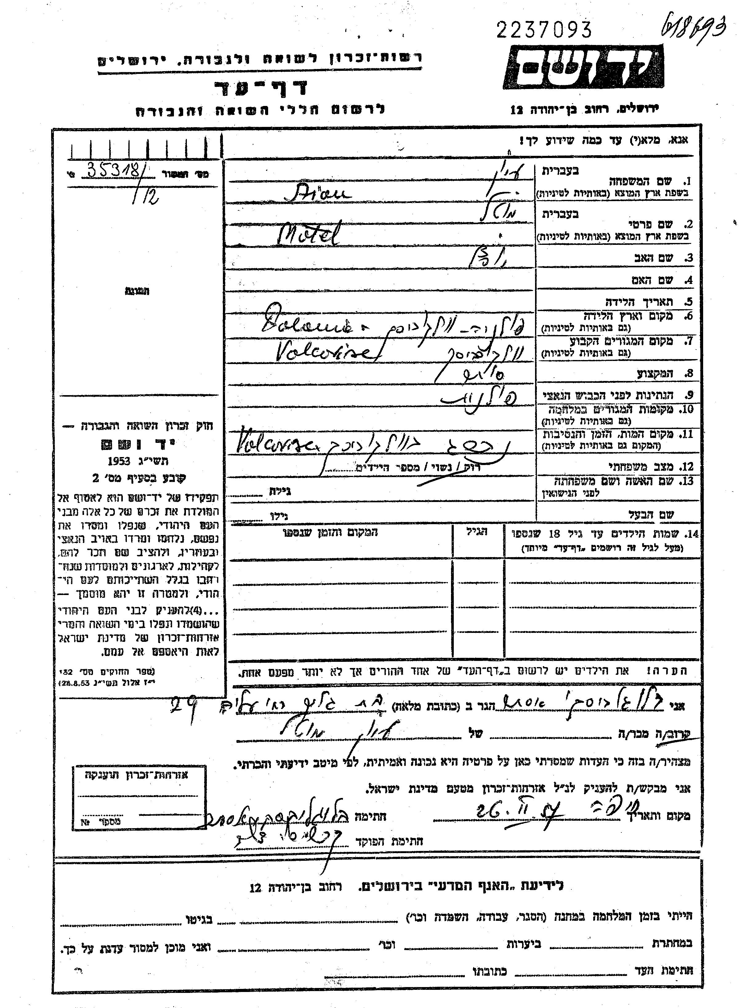 Motel Aion Ajun was born in Wolkowysk, Poland to Yosef. He was a merchant and married. Prior to WWII he lived in Wolkowysk, Poland. During the war he was in Wolkowysk, Poland.