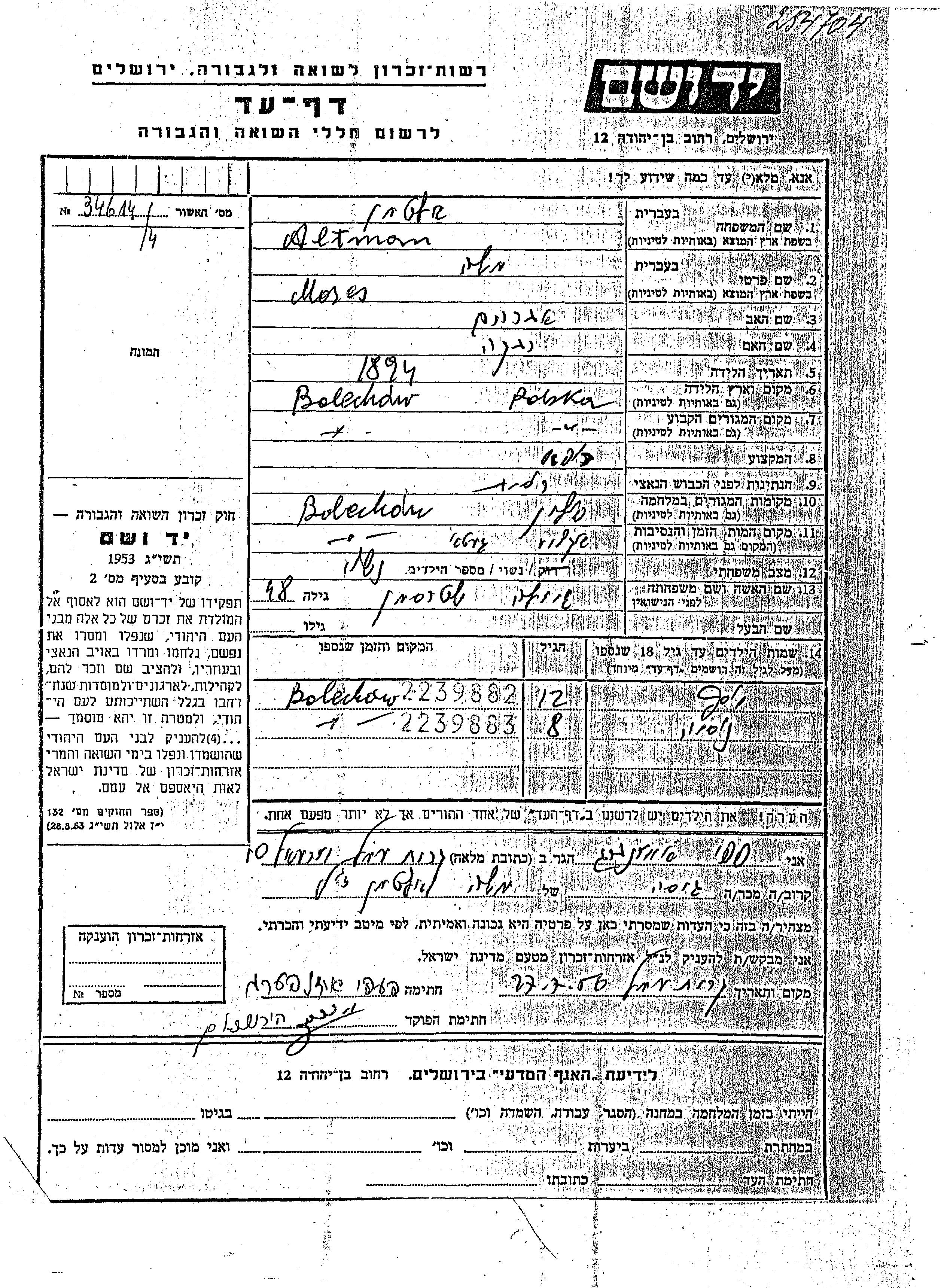 Yosef Altman was born in Bolechow, Poland to Moshe and Gizela nee Shtrasman. He was child. Prior to WWII he lived in Bolechow, Poland. During the war he was in Bolechow, Poland. Yosef was murdered in the Shoah. Place of death: Bolechow, Poland.