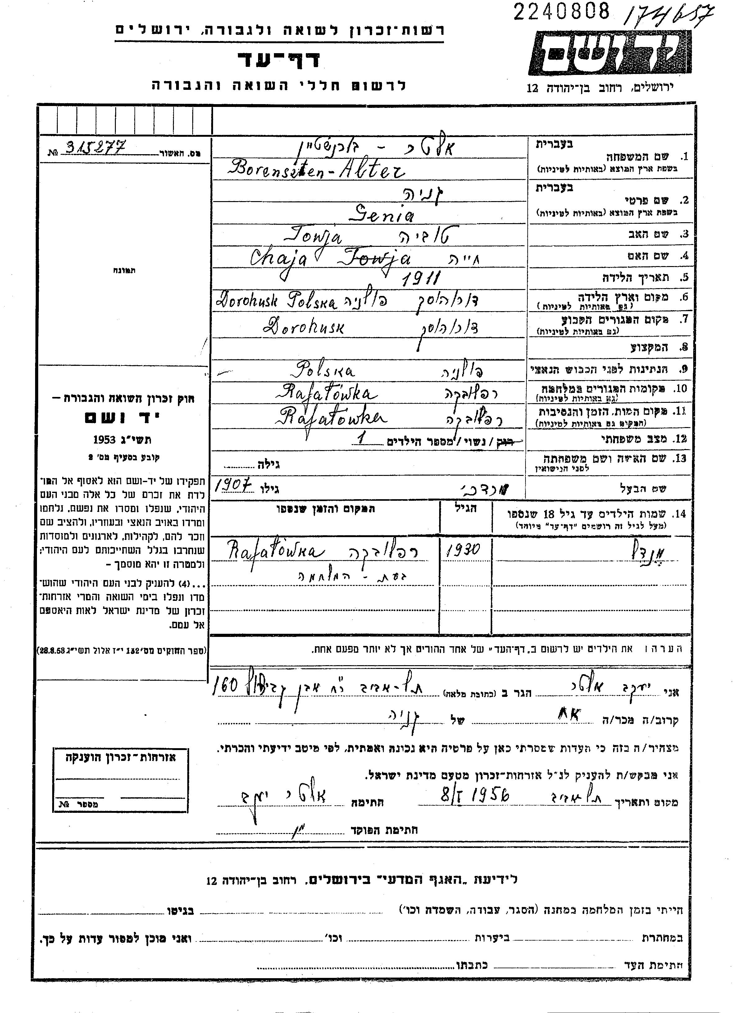 Borensztein Genia 1911 Dorohusk, Poland Page of Testimony