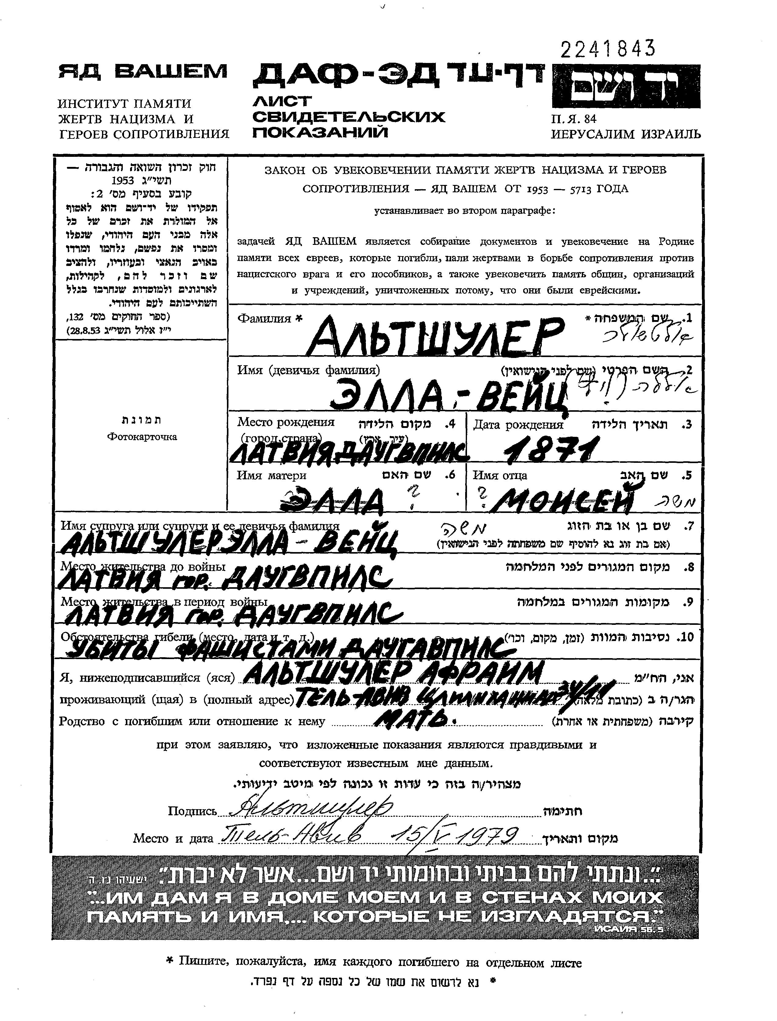 Ella Altshuler nee Veitz was born in Daugavpils, Latvia, 1871. She was married to Moisei. Prior to WWII she lived in Daugavpils, Latvia. During the war she was in Daugavpils, Latvia. Ella was murdered in the Shoah. Place of death: Daugavpils, Latvia.
