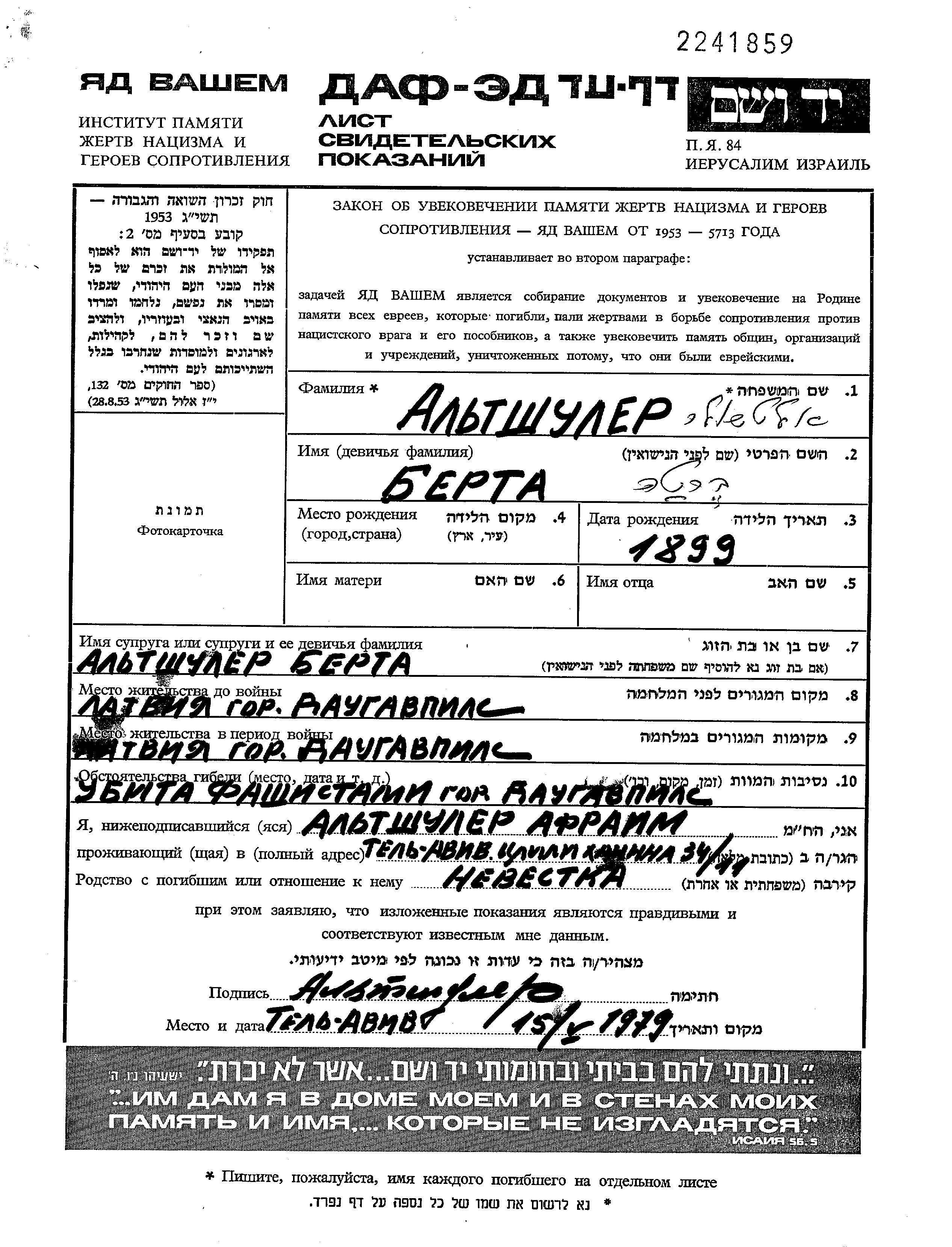 Berta Altshuler was born, 1899. She was married to Vulf. Prior to WWII she lived in Daugavpils, Latvia. During the war she was in Daugavpils, Latvia. Berta was murdered in the Shoah. Place of death: Daugavpils, Latvia.
