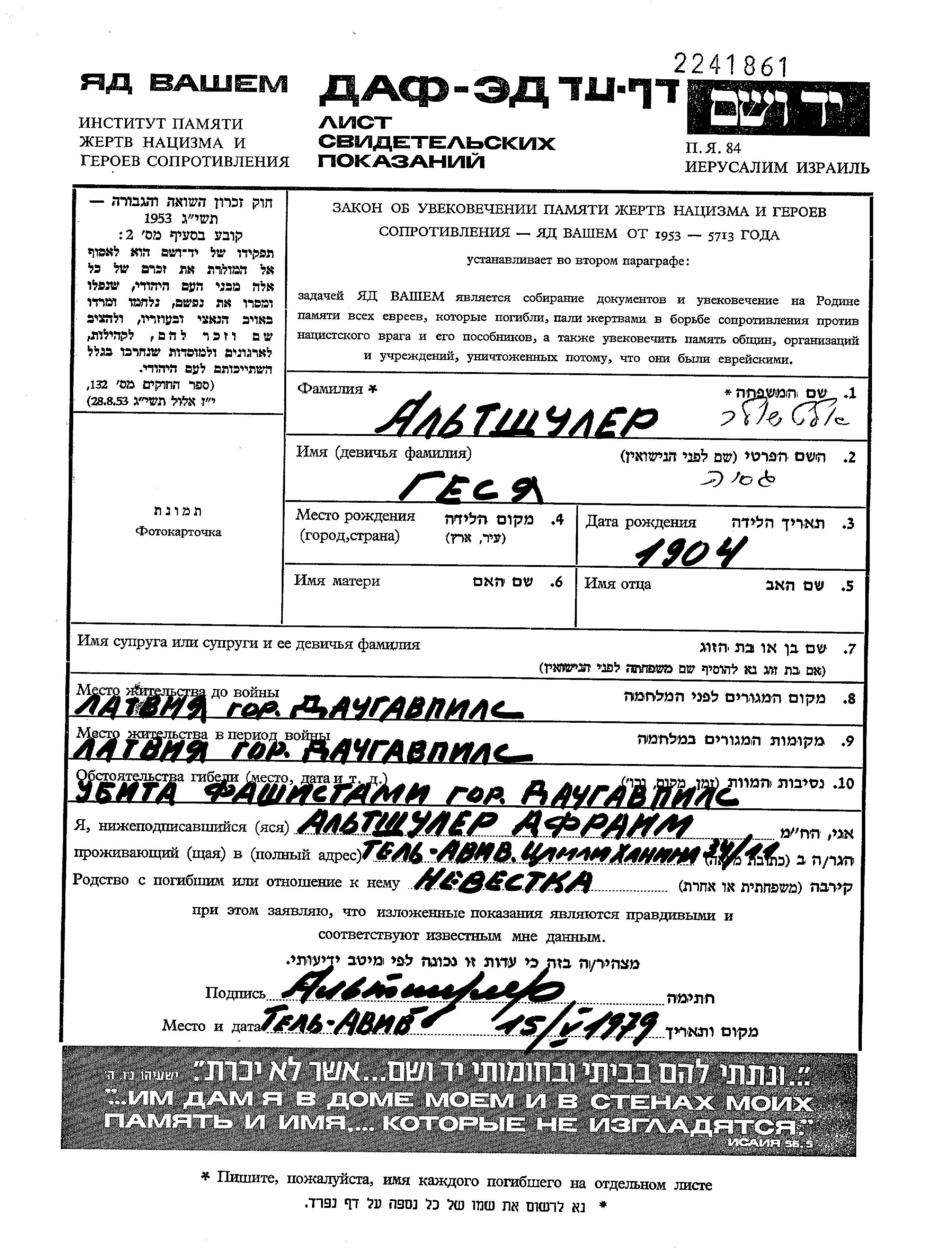Gesia Altshuler was born, 1904. Prior to WWII she lived in Daugavpils, Latvia. During the war she was in Daugavpils, Latvia. Gesia was murdered in the Shoah. Place of death: Daugavpils, Latvia.