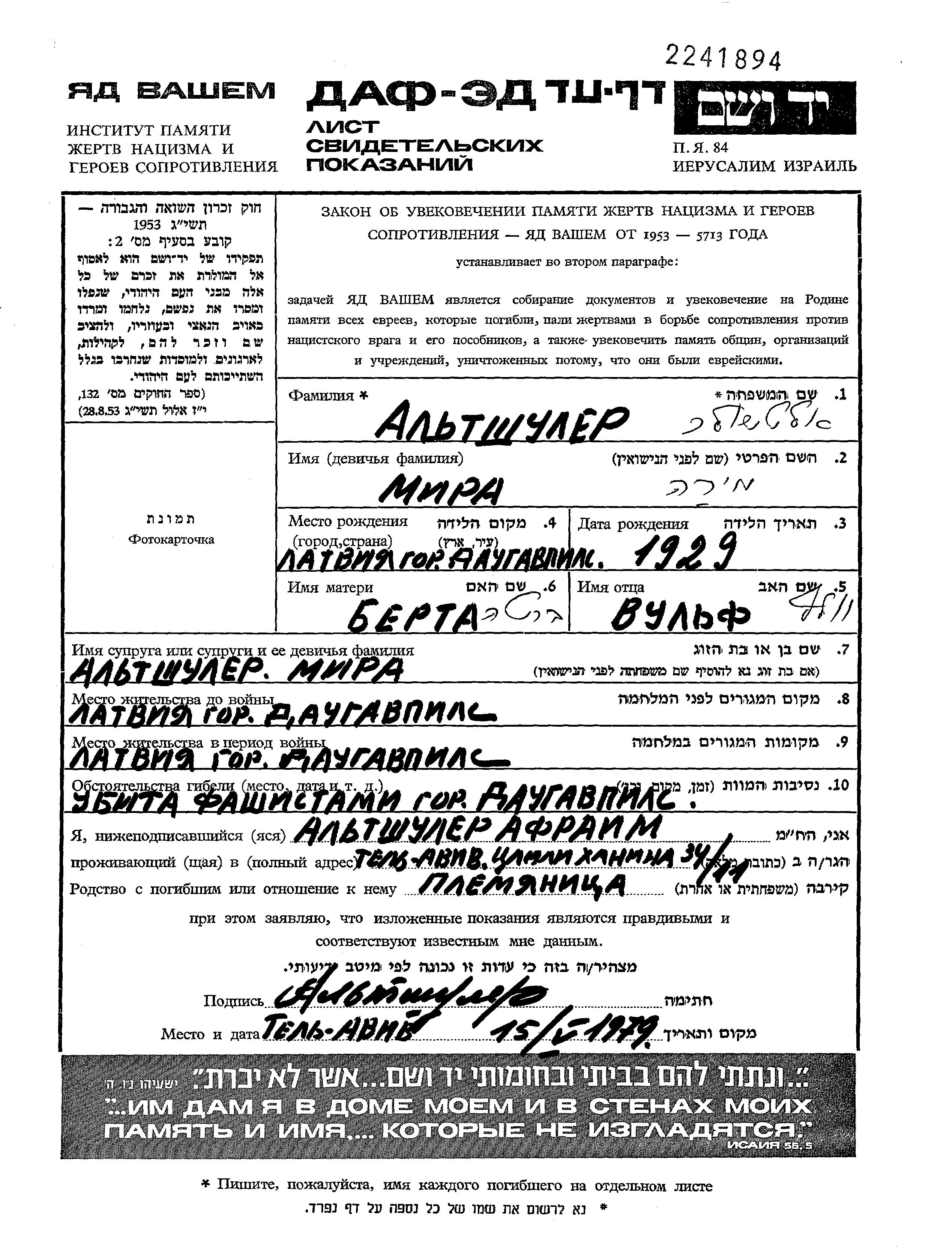 Mira Altshuler was born in Daugavpils, Latvia, 1929 to Vulf and Berta. She was child. Prior to WWII she lived in Daugavpils, Latvia. During the war she was in Daugavpils, Latvia.