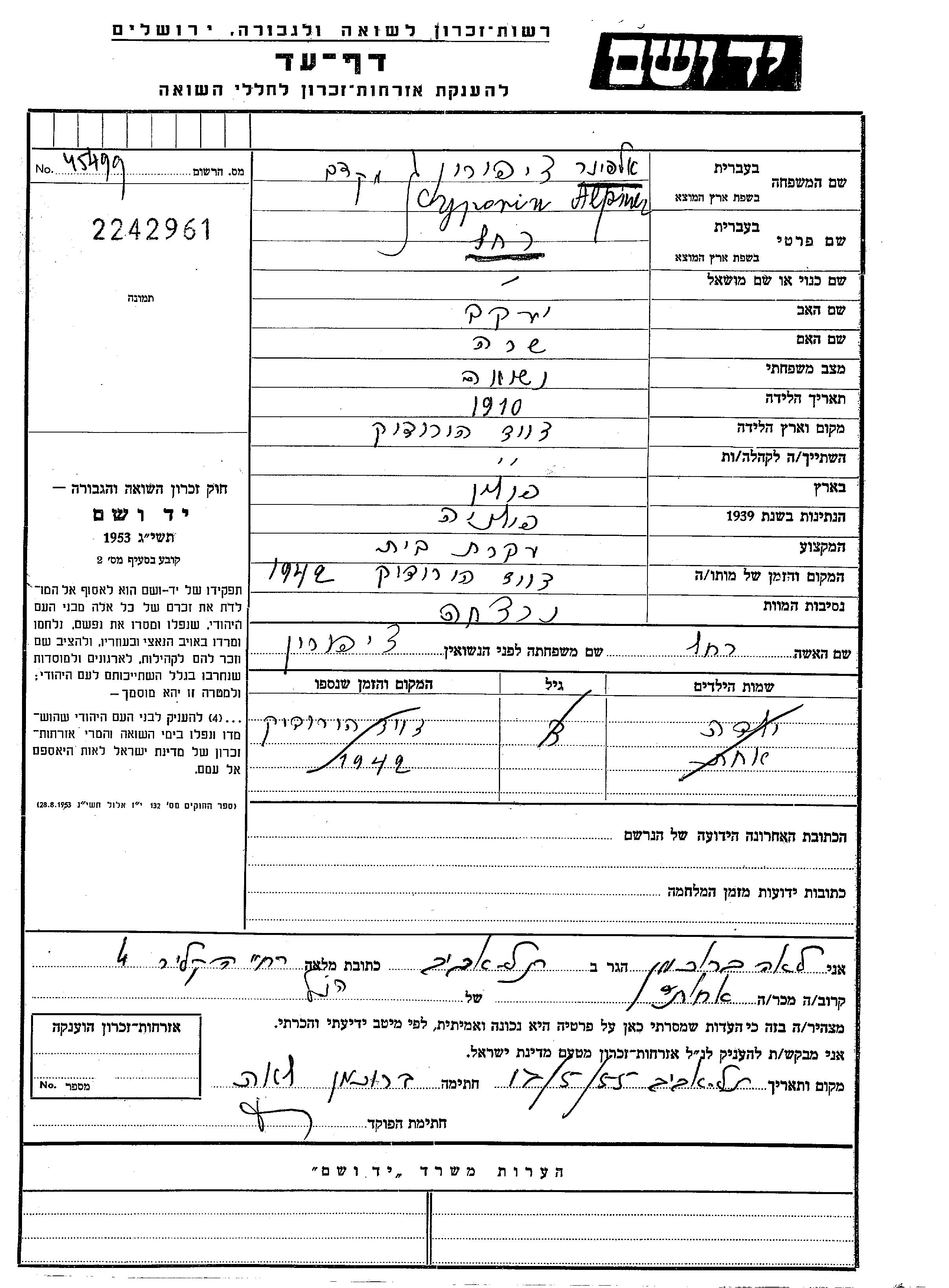 Rakhel Alpiner nee Cyporin was born in Dawidgrodek, Poland, 1910 to Yaakov and Sara. She was a housewife and married. Prior to WWII she lived in Dawidgrodek, Poland. During the war she was in Dawidgrodek, Poland. Rakhel was murdered in the Shoah. Place of death: Dawidgrodek, Poland, 1942.