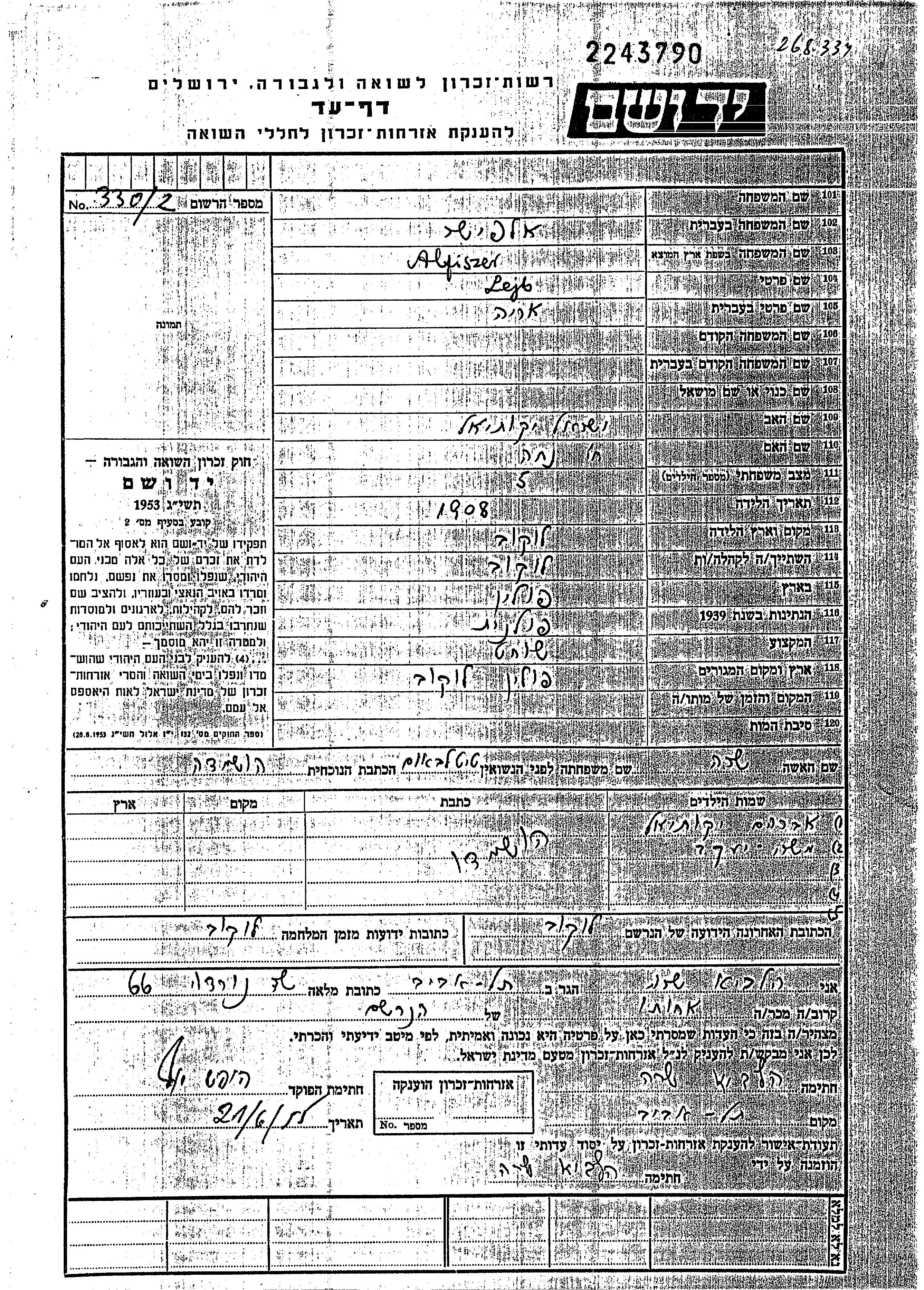 Jakov Moshe Alfiszer was born in Lukow, Poland to Lejb Arie and Sara nee Titelbaum. He was child. Prior to WWII he lived in Lukow, Poland. During the war he was in Lukow, Poland. Jakov Moshe was murdered in the Shoah.
