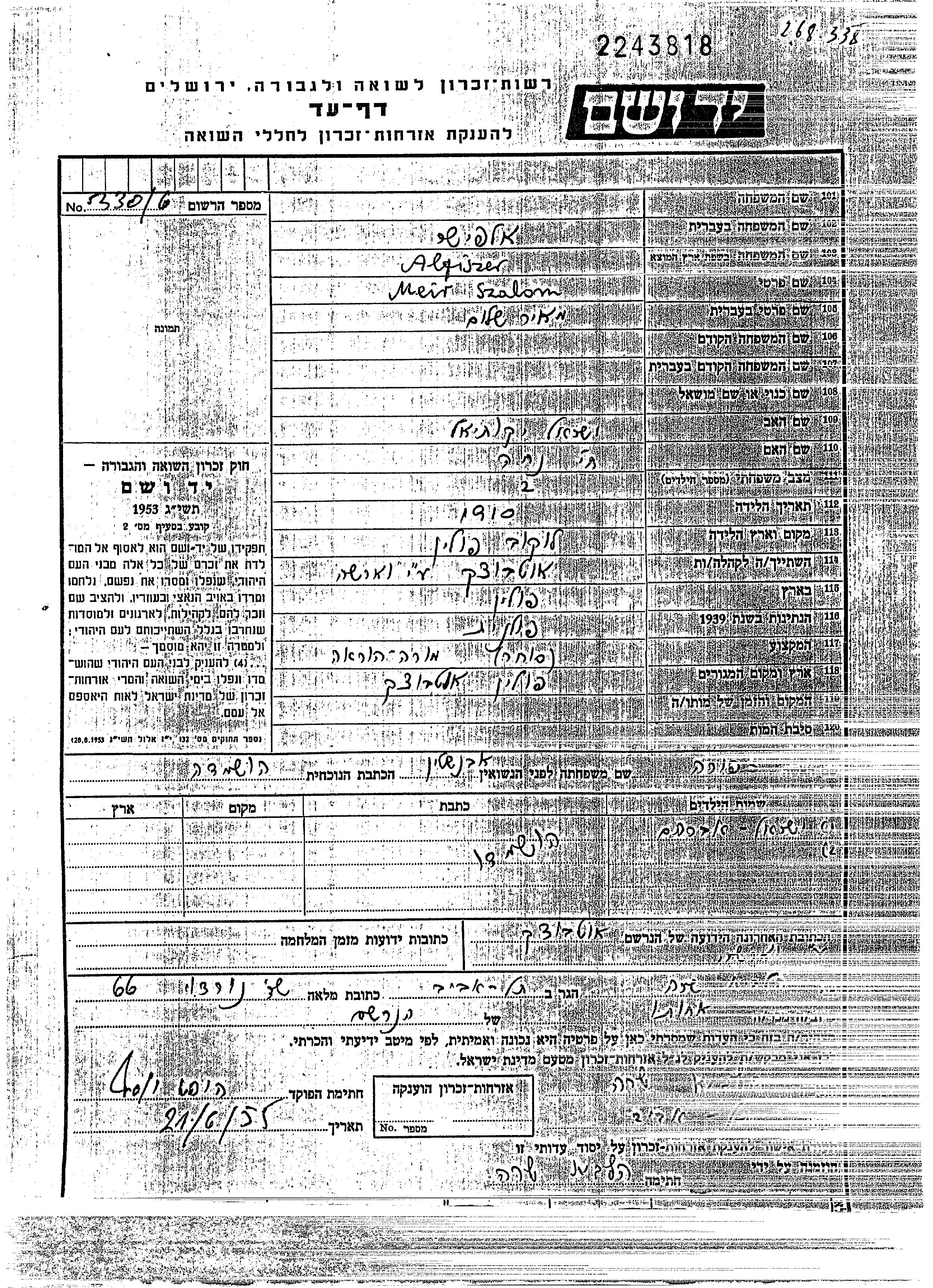 Israel Abraham Alfiszer was born in Otwock, Poland to Meir Szalom and Tzipora nee Ebenshtein. He was child. Prior to WWII he lived in Otwock, Poland. During the war he was in Otwock, Poland. Israel Abraham was murdered in the Shoah.