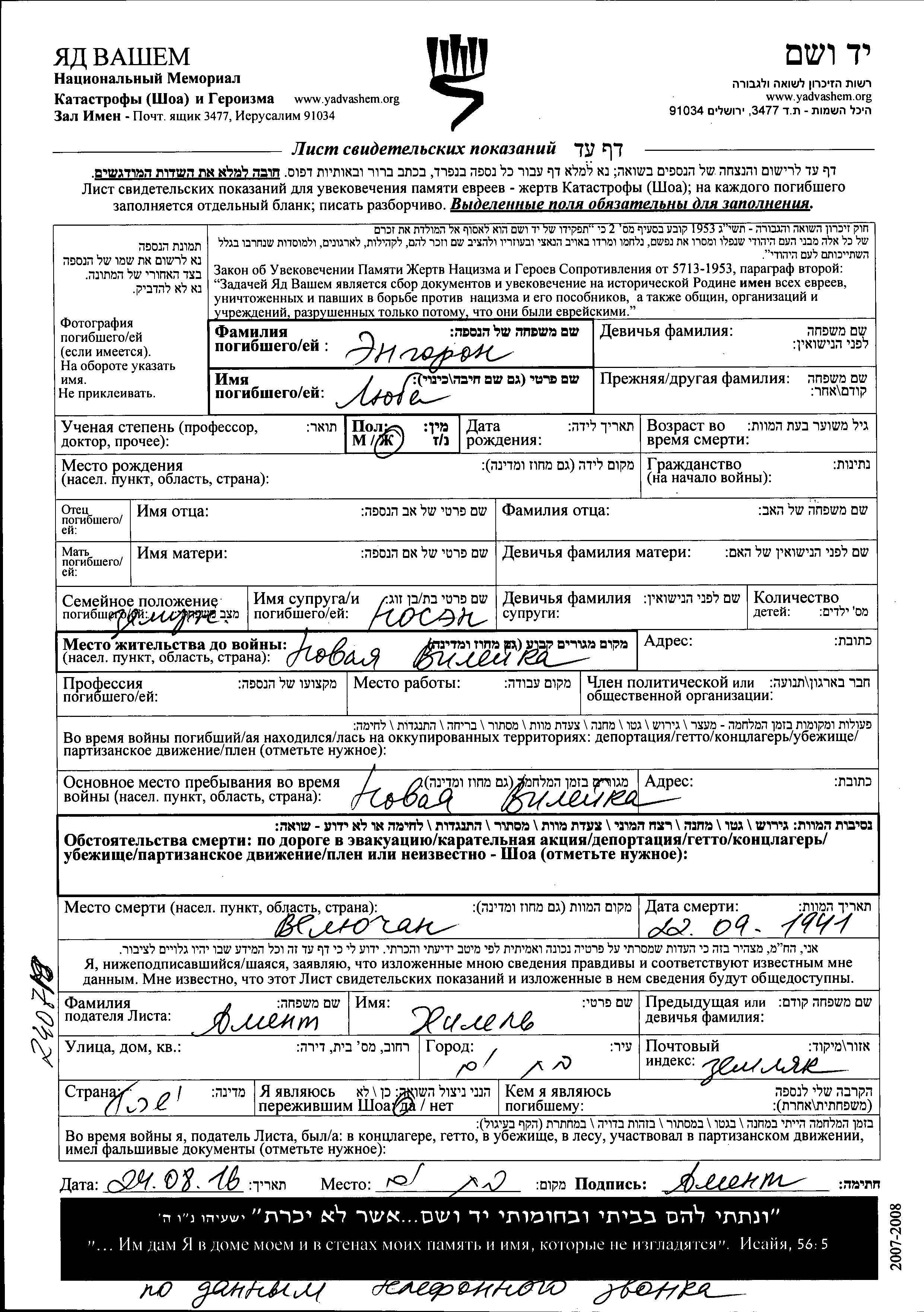 Lyuba Engron. She was married to Nosen. Prior to WWII she lived in Novaya Vileyka, Poland. During the war she was in Novaya Vileyka, Poland. Lyuba was murdered in the Shoah. Place of death: Vilucian, Poland, 22/09/1941.