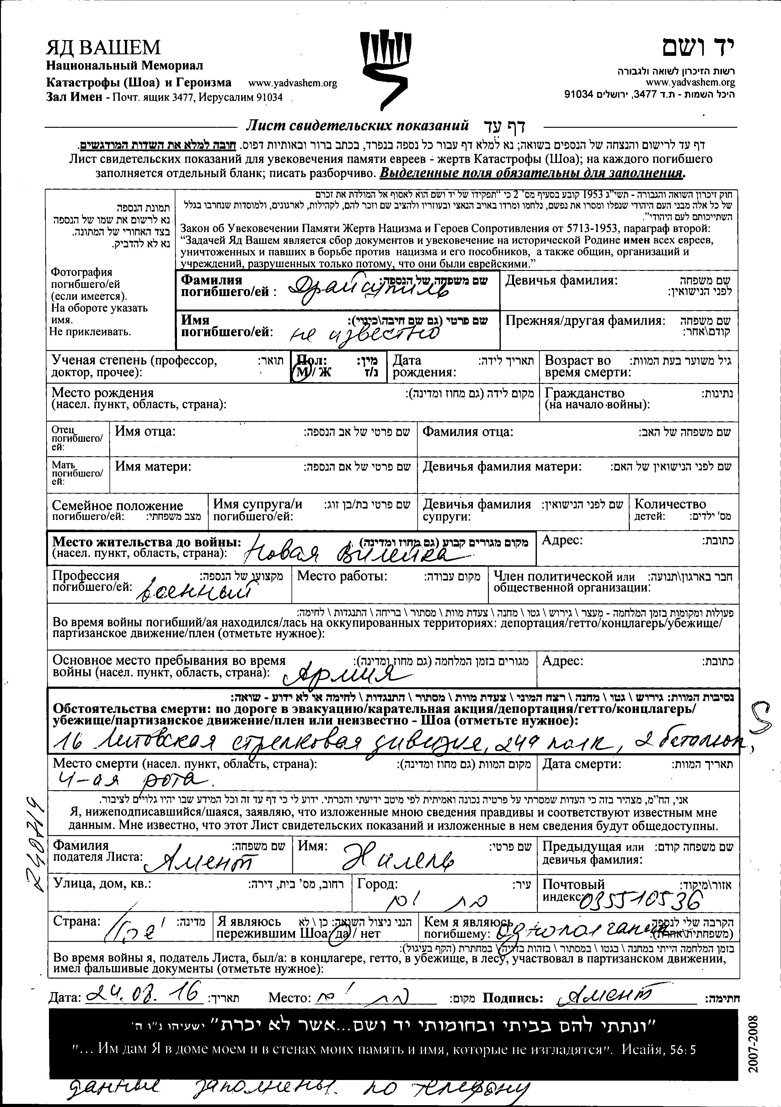 First name unknown Dreishpil. He was a military man. Prior to WWII he lived in Novaya Vileyka, Poland. During the war he was in Novaya Vileyka, Poland. He was killed in military service in WWII.