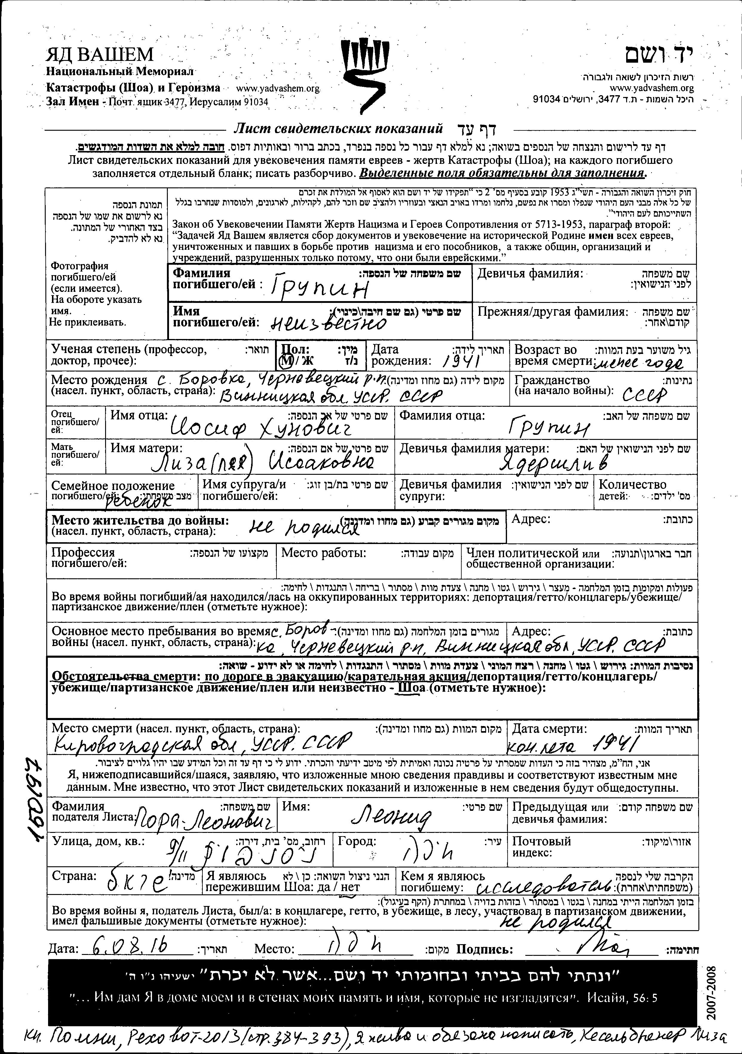 First name unknown Grupin was born in Borovka, Ukraine (USSR), 1941 to Iosif and Liza Leya nee Yadershliv. He was baby. Prior to WWII he lived in Borovka, Ukraine (USSR). During the war he was in Borovka, Ukraine (USSR). He was murdered in the Shoah. Place of death: Kirovograd, Ukraine (USSR), 08/1941.