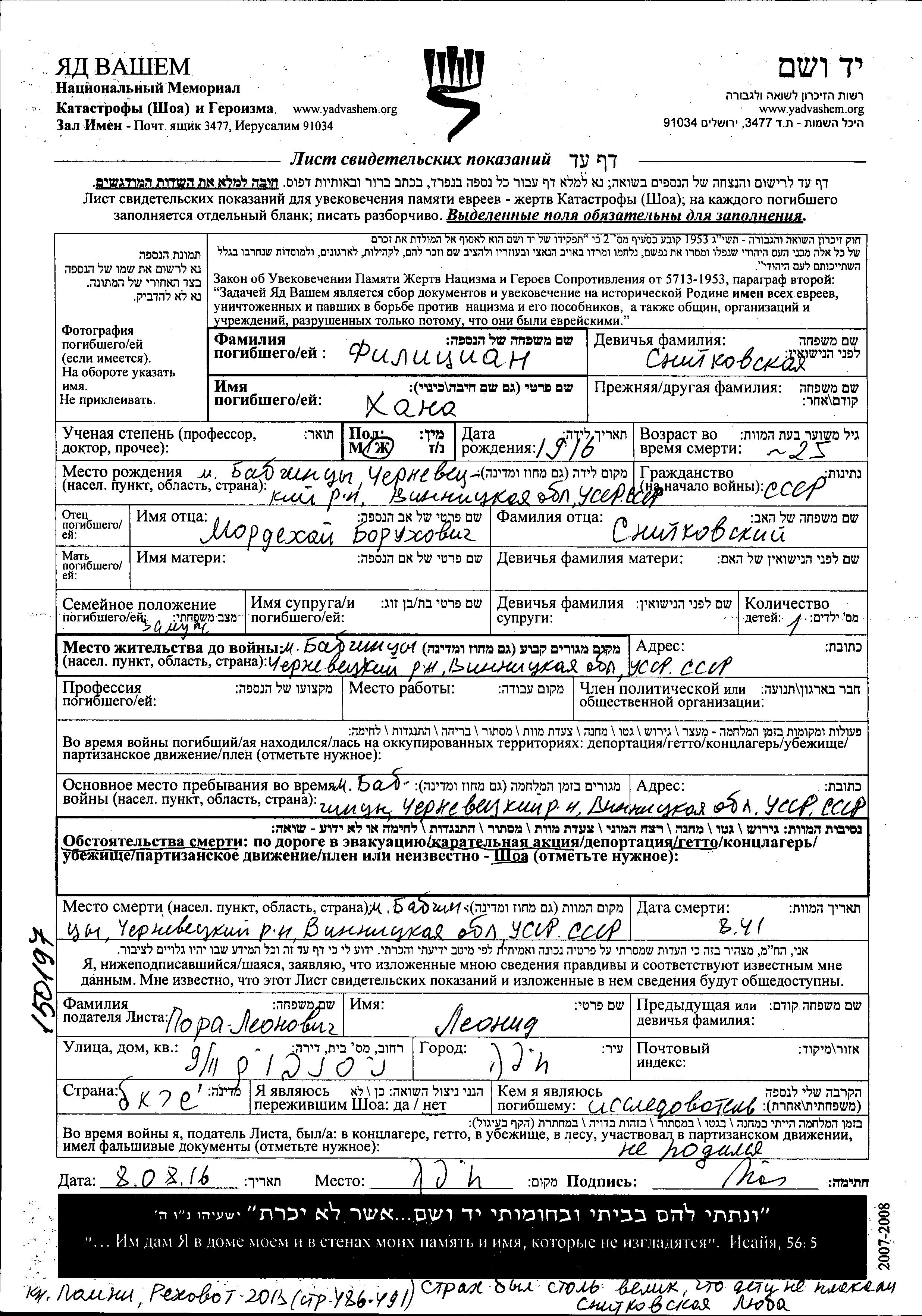 Khana Filitzian nee Snitkovskaya was born in Babchintsy, Ukraine (USSR), 1916 to Mordekhay. She was married. Prior to WWII she lived in Babchintsy, Ukraine (USSR). During the war she was in Babchintsy, Ukraine (USSR). Khana was murdered in the Shoah. Place of death: Babchintsy, Ukraine (USSR), 08/1941.