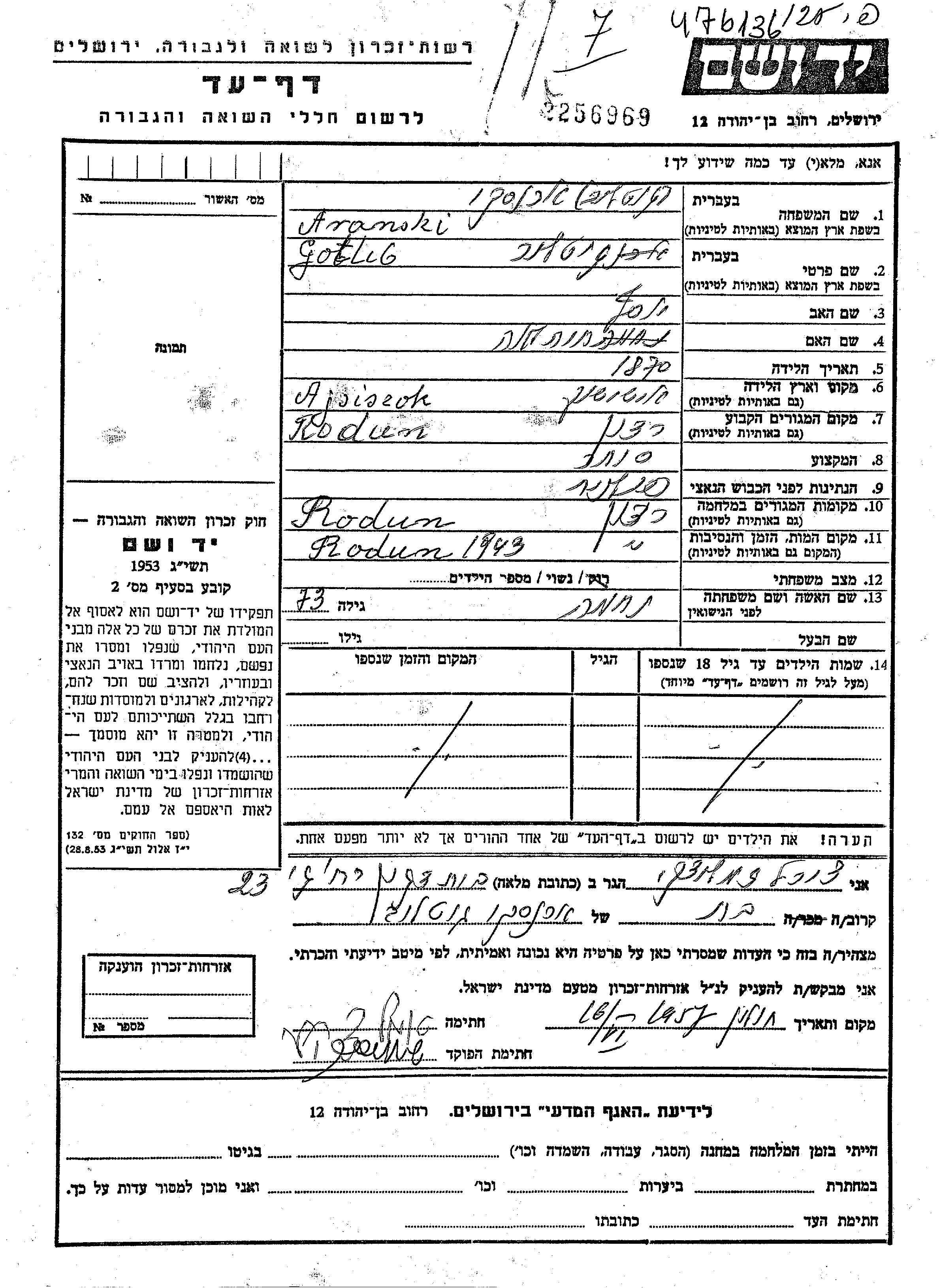 Gotlib Aranski was born in Aisheshuk, Poland, 1870 to Yosef and Khaia Lea. He was a merchant and married to Nechama. Prior to WWII he lived in Radun, Poland. During the war he was in Radun, Poland. Gotlib was murdered in the Shoah. Place of death: Radun, Poland, 1943.