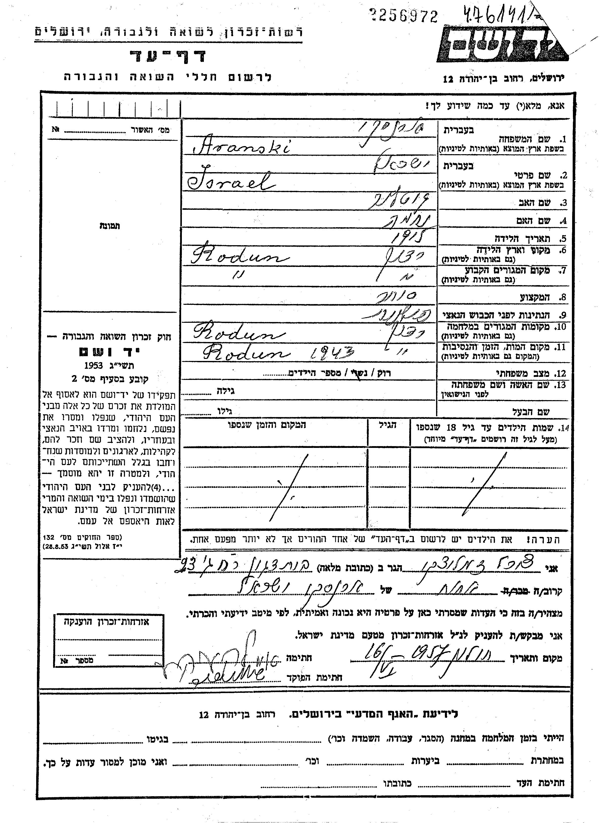 Israel Aranski was born in Radun, Poland, 1915 to Gotlib and Nechama. He was a merchant and single. Prior to WWII he lived in Radun, Poland. During the war he was in Radun, Poland. Israel was murdered in the Shoah. Place of death: Radun, Poland, 1943.