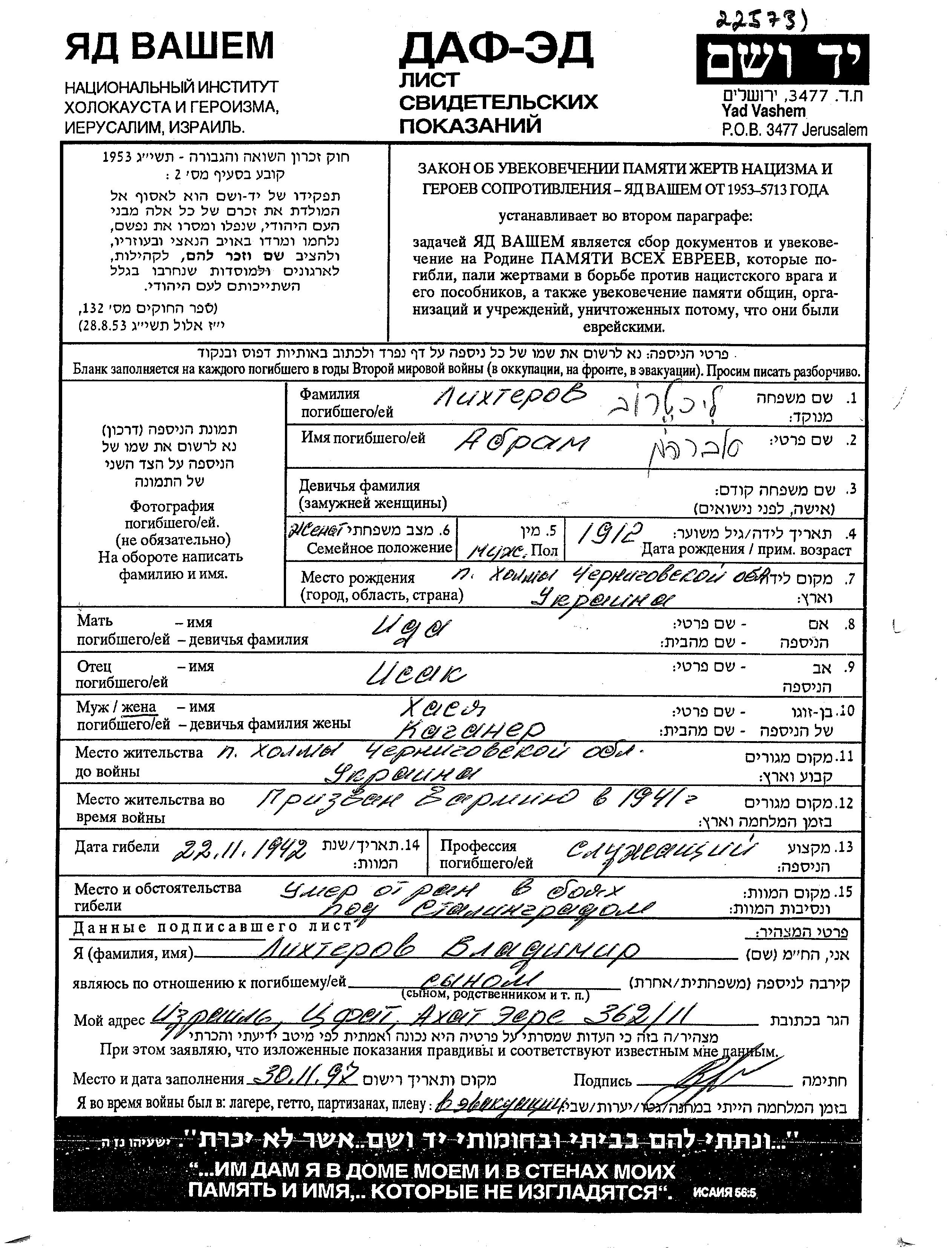Abram Likhterov was born in Kholmy, Ukraine (USSR), 1912 to Isak and Ida. He was a clerk and married to Khasya. Prior to WWII he lived in Kholmy, Ukraine (USSR). During the war he was in the Soviet armed forces. Abram was killed in military service in WWII. Place of death: Stalingrad, Russia (USSR), 22/11/1942.