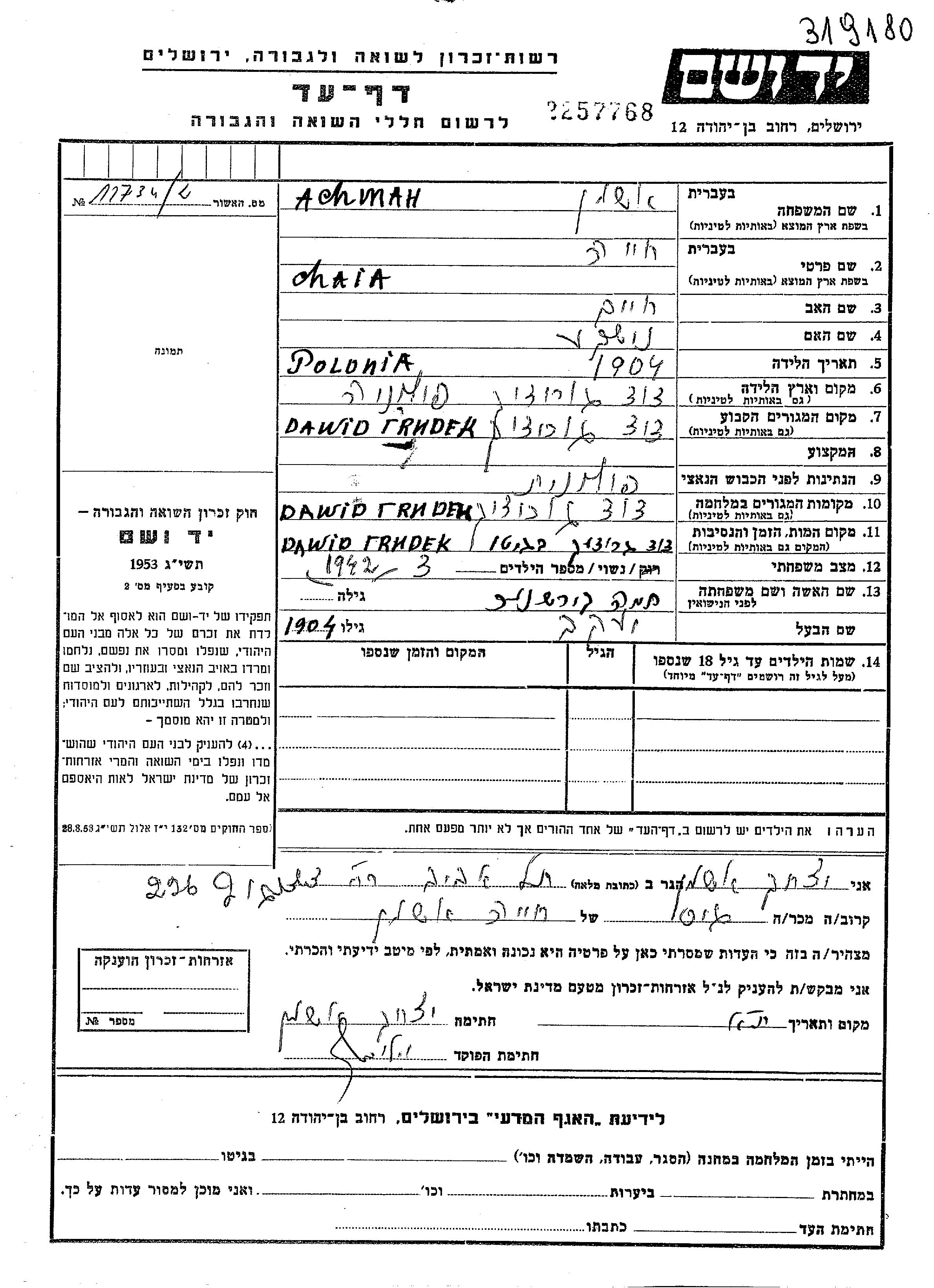 Chaia Achman nee Kirshner was born in David Horodok, Poland, 1904 to Khaim and Nishke. She was married to Yakov. Prior to WWII she lived in David Horodok, Poland. During the war she was in David Horodok, Poland. Chaia was murdered in the Shoah. Place of death: David Horodok, Poland, 1942.