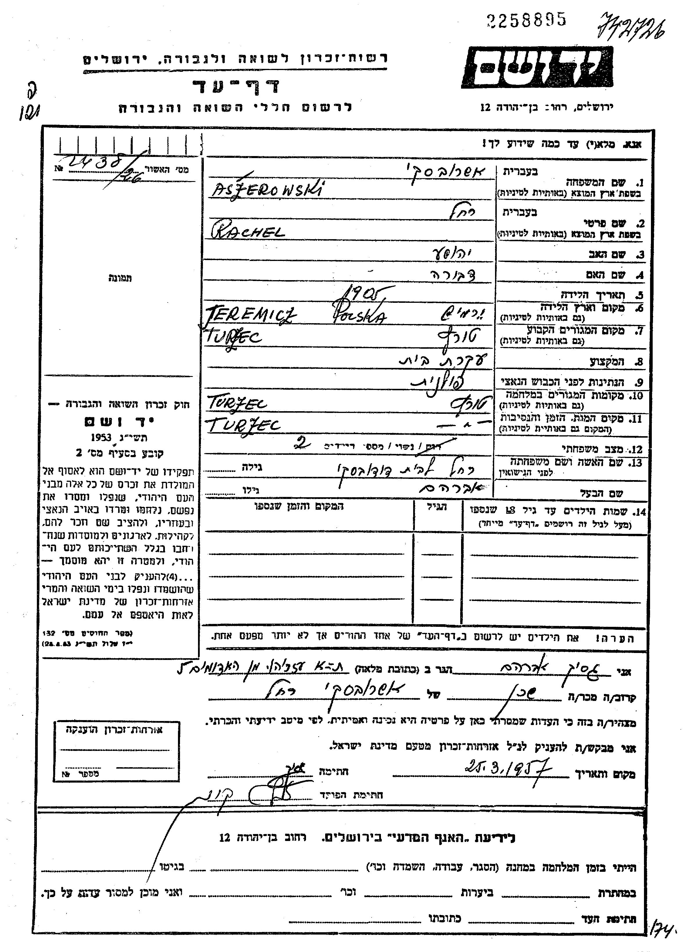 Rachel Aszerowski nee Dudovski was born in Jeremicze, Poland, 1905 to Yehoshua and Dvora. She was a housewife and married to Abraham. Prior to WWII she lived in Turzec, Poland. During the war she was in Turzec, Poland. Rachel was murdered in the Shoah.
