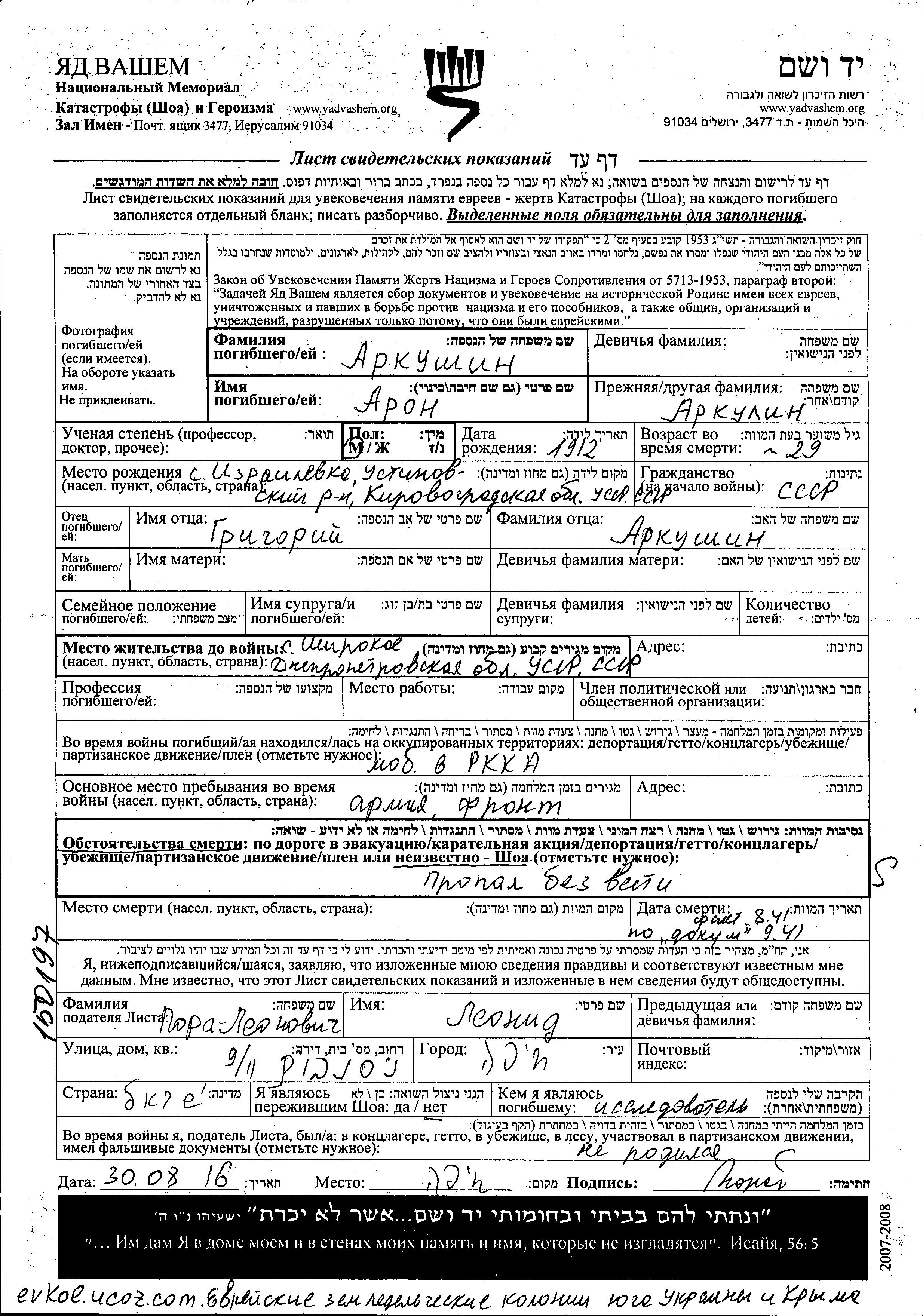 Aron Arkushin was born in Izrailovka, Ukraine (USSR), 1912 to Grigoriy. Prior to WWII he lived in Shirokoye, Ukraine (USSR). During the war he was in the Soviet armed forces. Aron was murdered in the Shoah. Place of death: unknown, 08/1941.