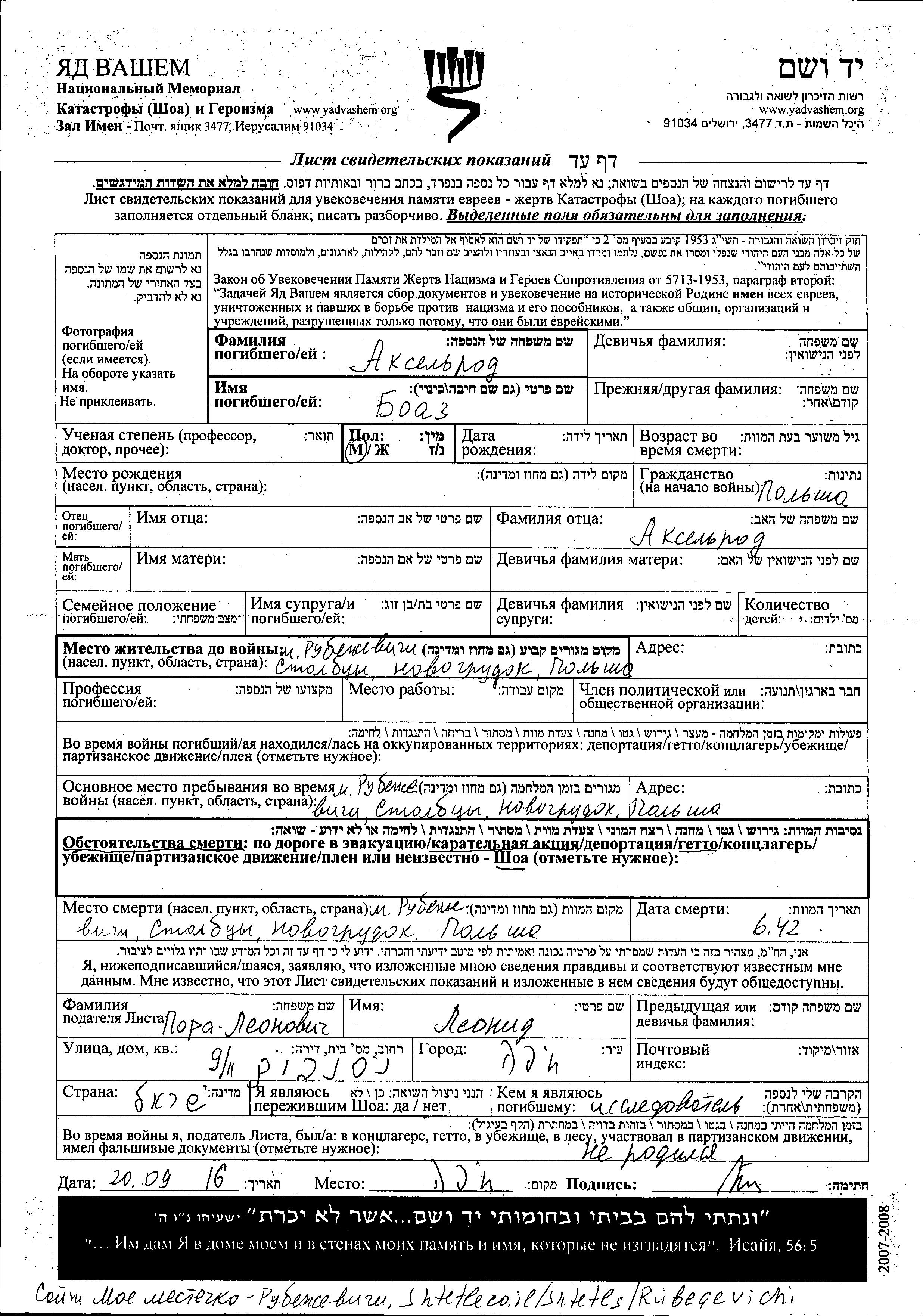 Boaz Akselrod. Prior to WWII he lived in Rubezhevichi, Poland. During the war he was in Rubezhevichi, Poland. Boaz was murdered in the Shoah. Place of death: Rubezhevichi, Poland, 06/1942.
