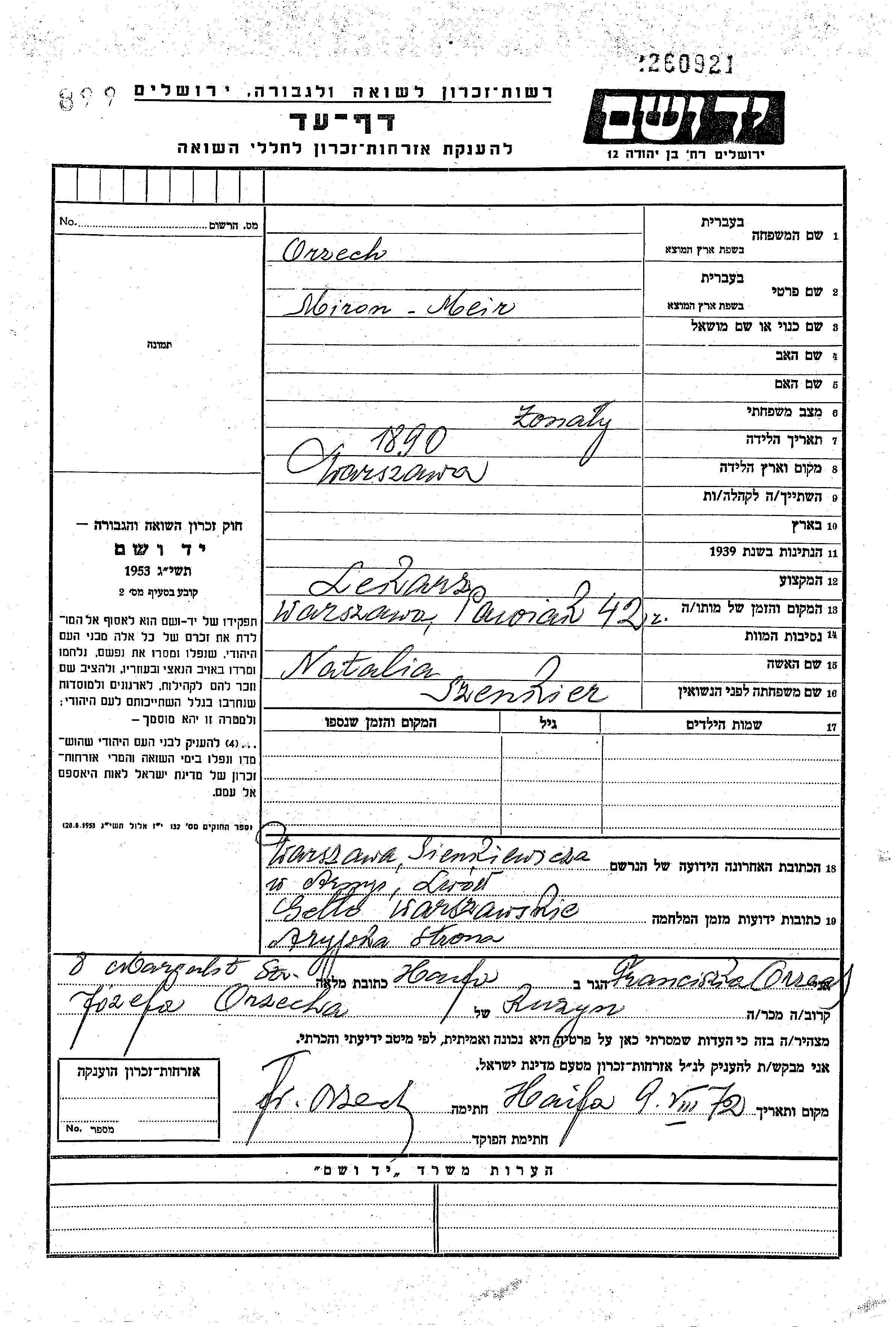 Meir Miron Orzech was born in Warszawa, Poland, 1890. He was a physician and married to Natalia. Prior to WWII he lived in Warszawa, Poland. During the war he was in Warszawa, Poland. Meir Miron was murdered in the Shoah. Place of death: Warszawa, Poland, 1942.