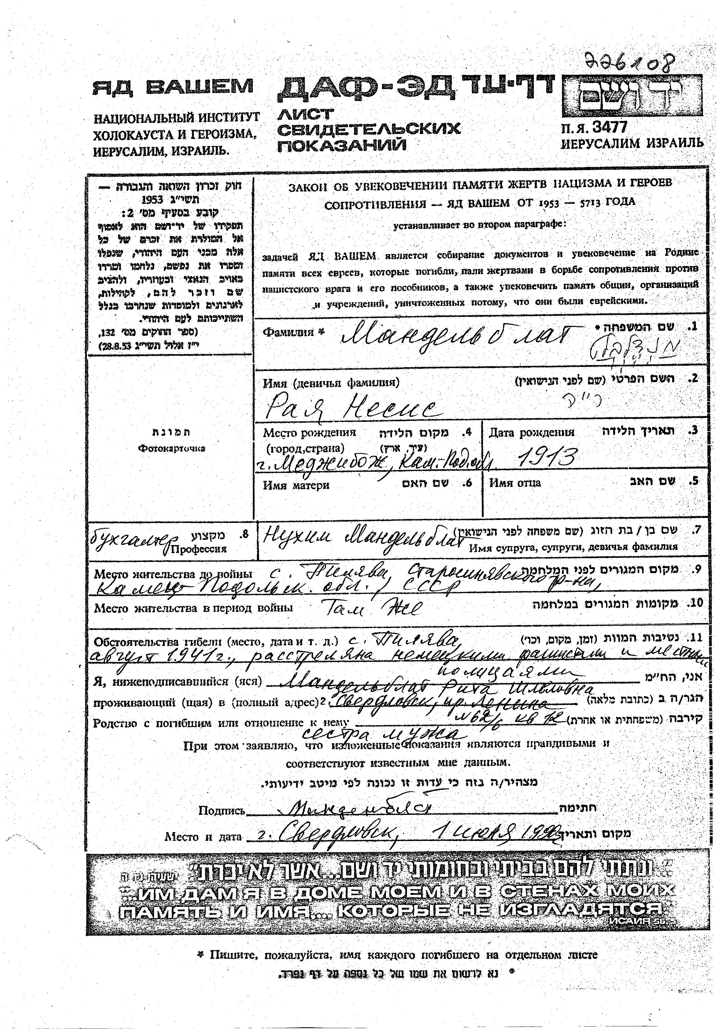 Mandelblat Raya 1913 Pilyava, Ukraine (USSR) Page of Testimony