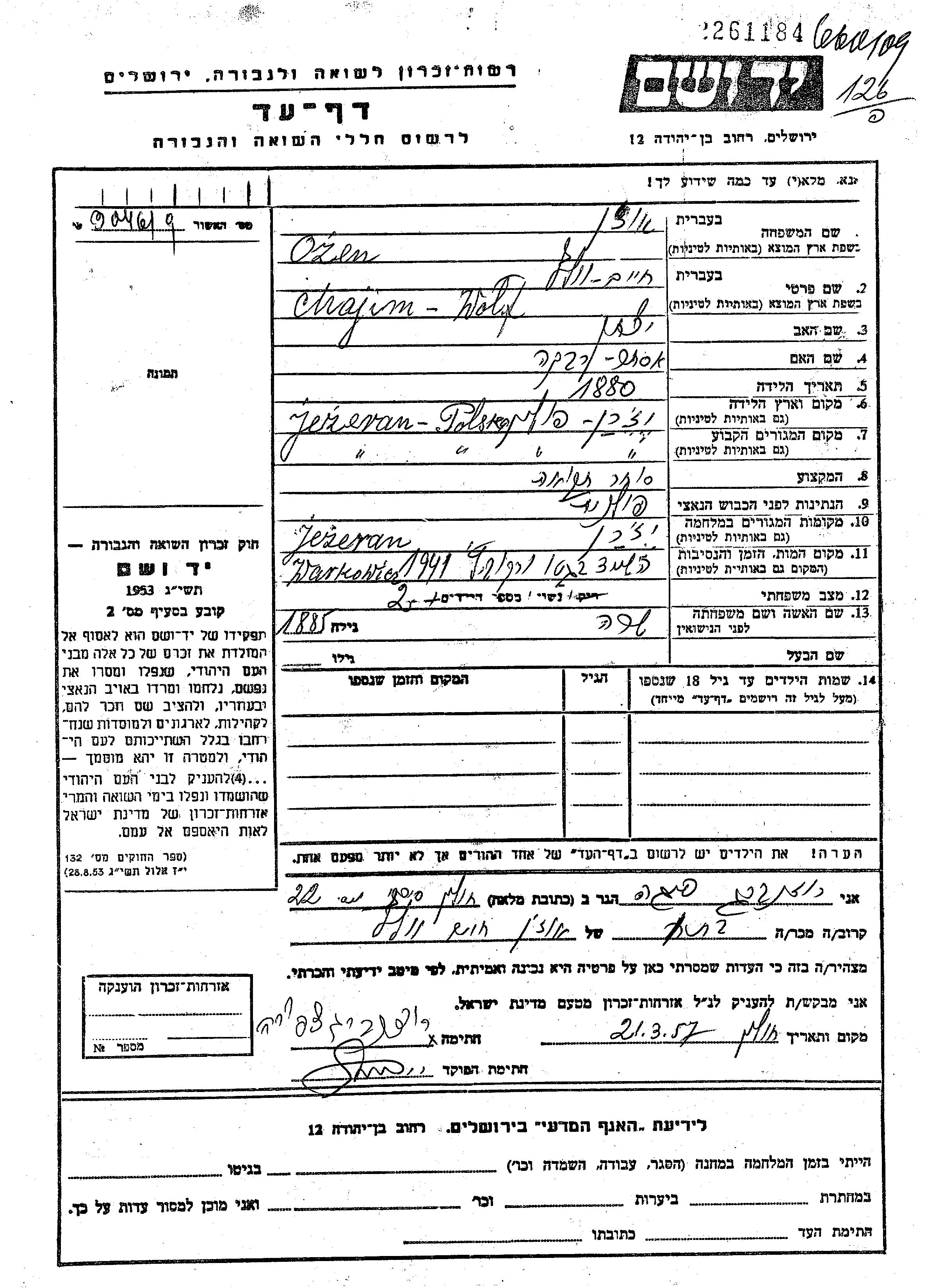Chajim Wolf Ozen was born in Jezierzany, Poland, 1880 to Yitzkhak and Ester Rivka. He was a grain merchant and married to Sara. Prior to WWII he lived in Jezierzany, Poland. During the war he was in Jezierzany, Poland. Chajim Wolf was murdered in the Shoah. Place of death: Warkowicze, Poland, 1941.