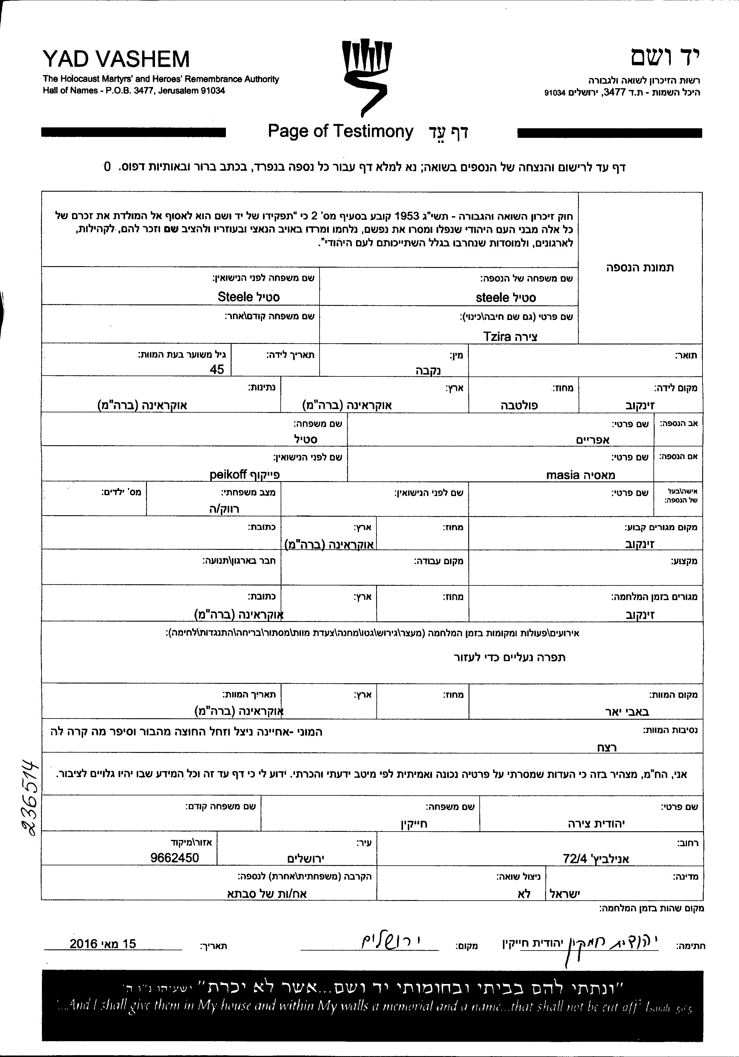 Tzira Steele was born in Zinkov, Ukraine (USSR) to Efraim and Masia nee Peikoff. She was a תופרת נעליים and single. Prior to WWII she lived in Zinkov, Ukraine (USSR). During the war she was in Zinkov, Ukraine (USSR). Tzira was murdered in the Shoah. Place of death: Babi Yar, Ukraine (USSR).