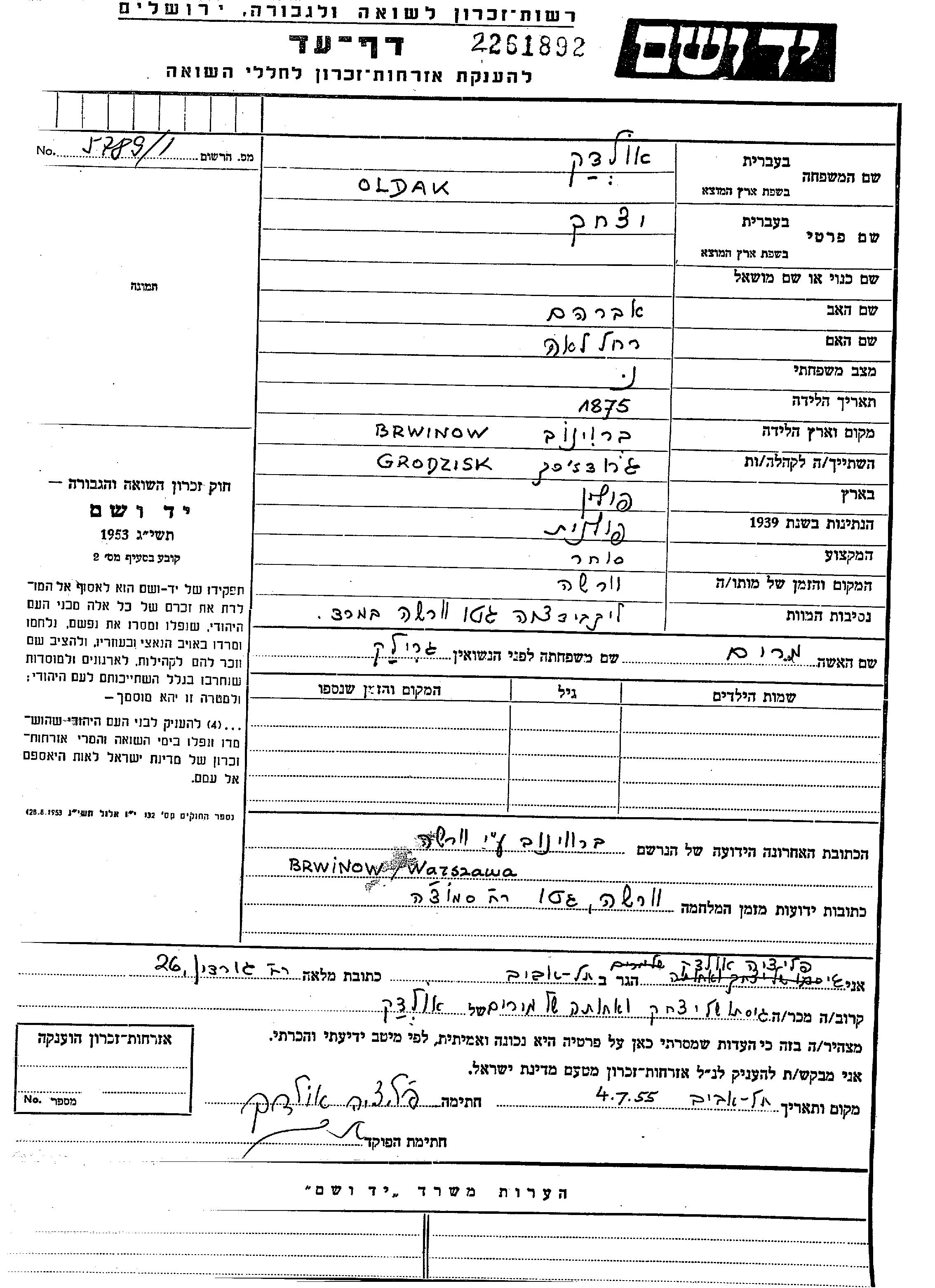 Ytzkhak Oldak was born in Brwinow, Poland, 1875 to Abraham and Rakhel Lea. He was a merchant and married to Miriam. Prior to WWII he lived in Grodzisk Mazowiecki, Poland. During the war he was in Warszawa, Poland. Ytzkhak was murdered in the Shoah. Place of death: Warszawa, Poland.