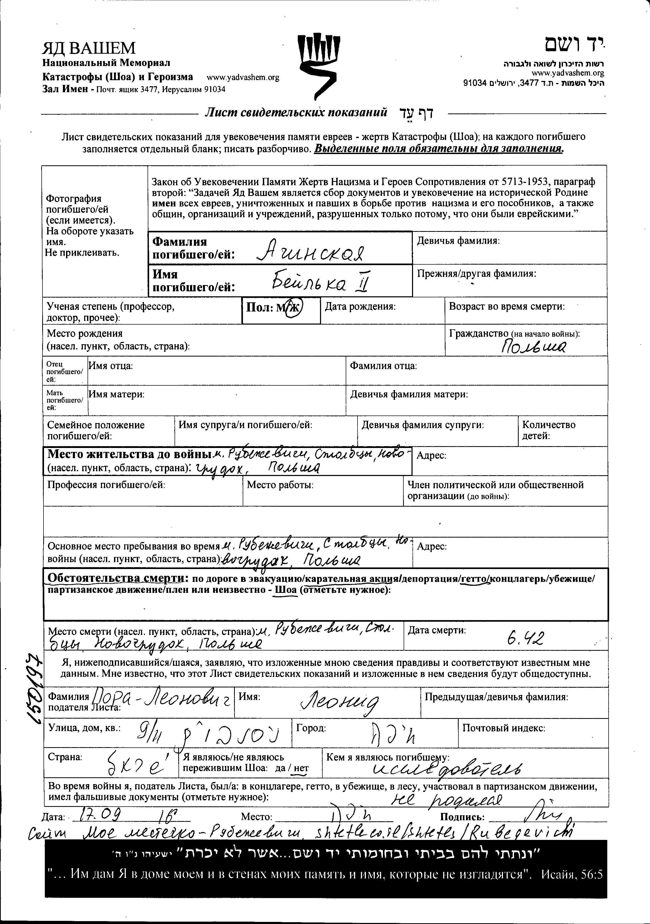 Beylka Aginskaya. Prior to WWII she lived in Rubezhevichi, Poland. During the war she was in Rubezhevichi, Poland. Beylka was murdered in the Shoah. Place of death: Rubezhevichi, Poland, 06/1942.