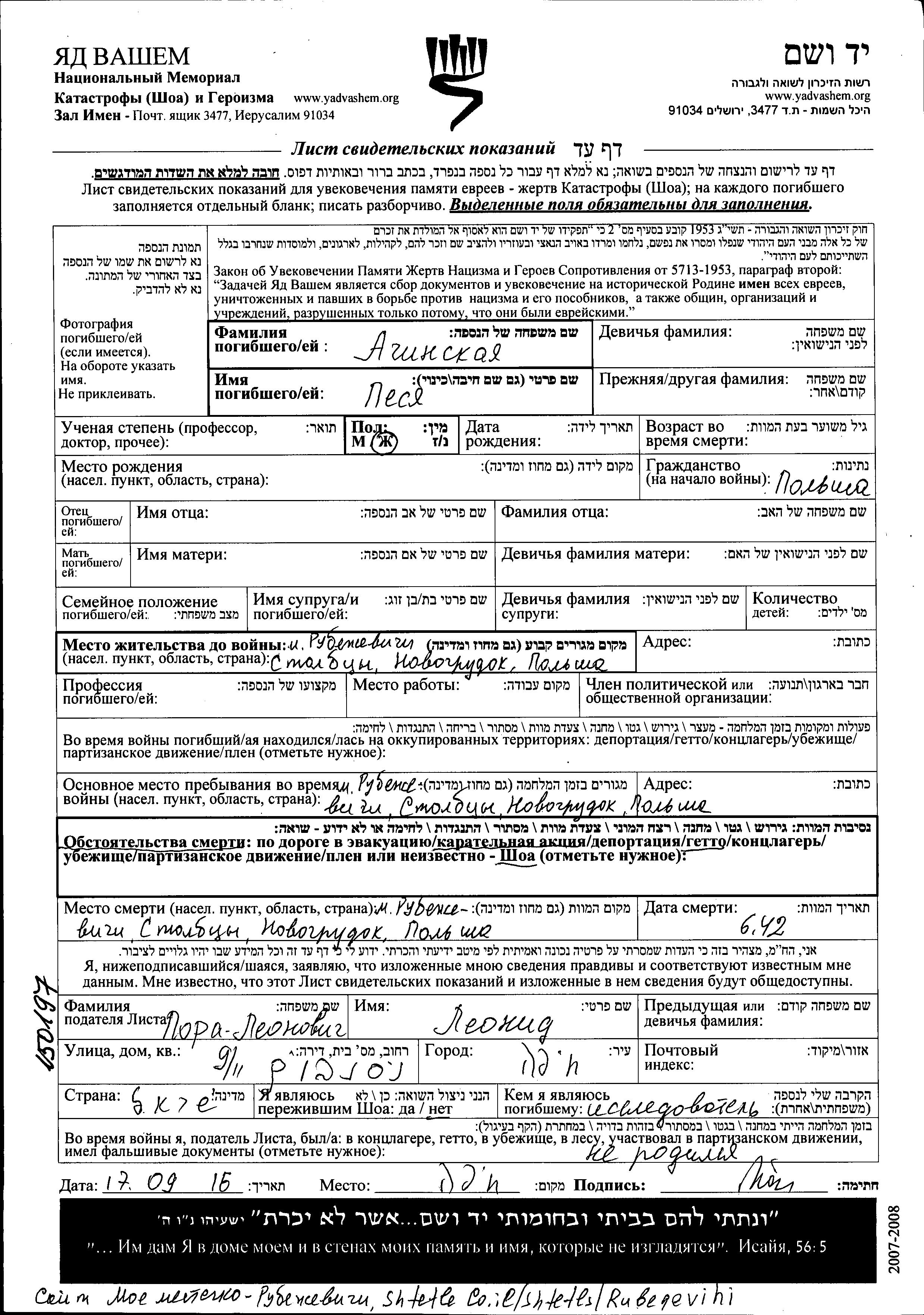 Pesya Aginskaya. Prior to WWII she lived in Rubezhevichi, Poland. During the war she was in Rubezhevichi, Poland. Pesya was murdered in the Shoah. Place of death: Rubezhevichi, Poland, 06/1942.