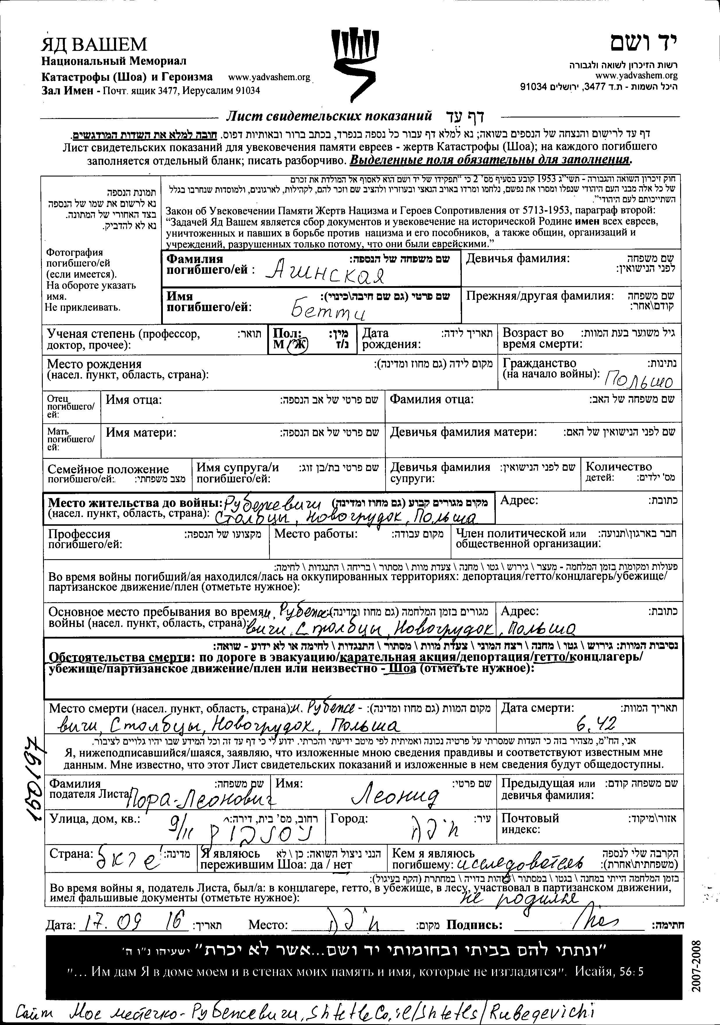 Betti Aginskaya. Prior to WWII she lived in Rubezhevichi, Poland. During the war she was in Rubezhevichi, Poland. Betti was murdered in the Shoah. Place of death: Rubezhevichi, Poland, 06/1942.