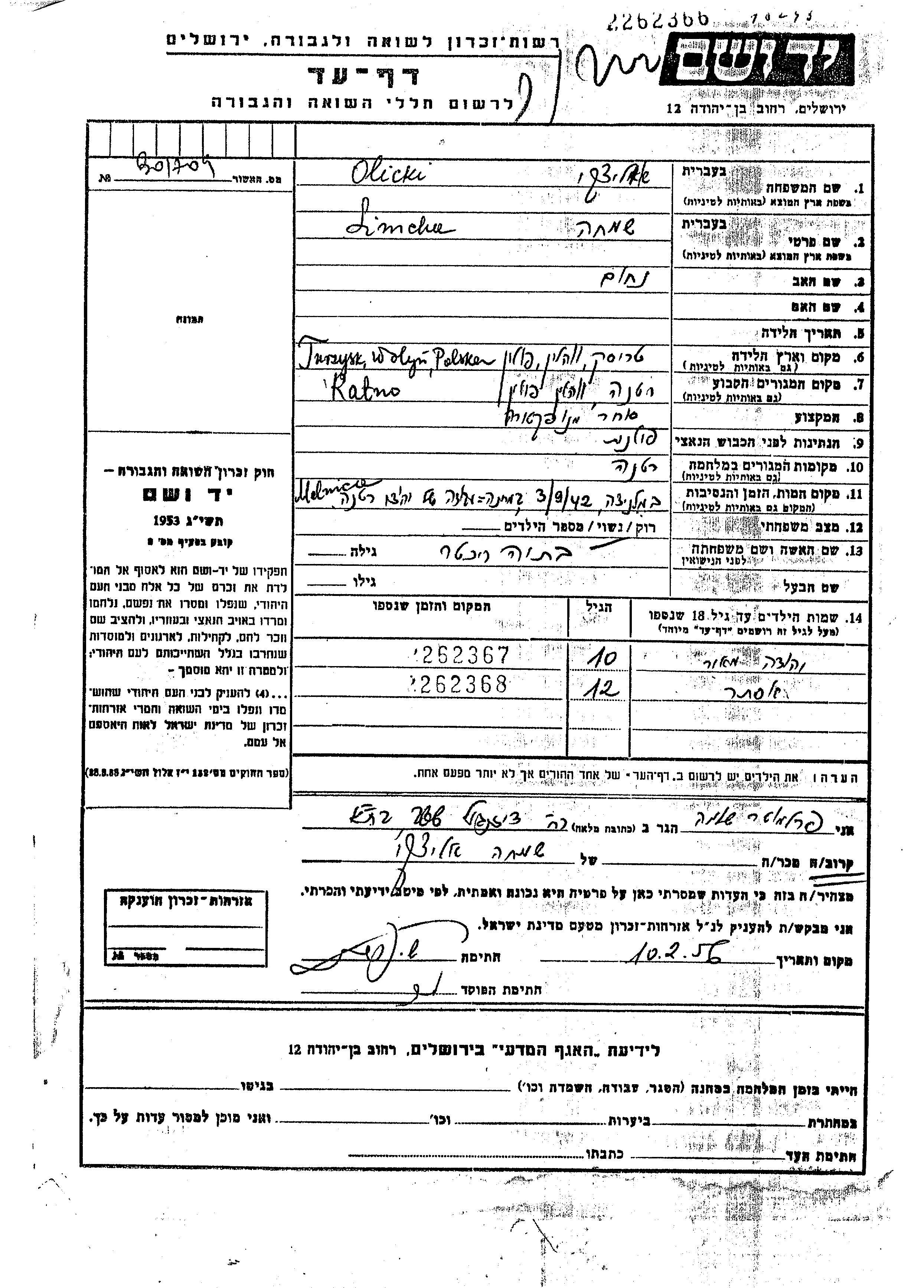 Simcha Olicki was born in Turzysk, Poland to Nakhum. He was a merchant and married to Batia. Prior to WWII he lived in Ratno, Poland. During the war he was in Ratno, Poland. Simcha was murdered in the Shoah. Place of death: Ratno, Poland, 03/09/1942.