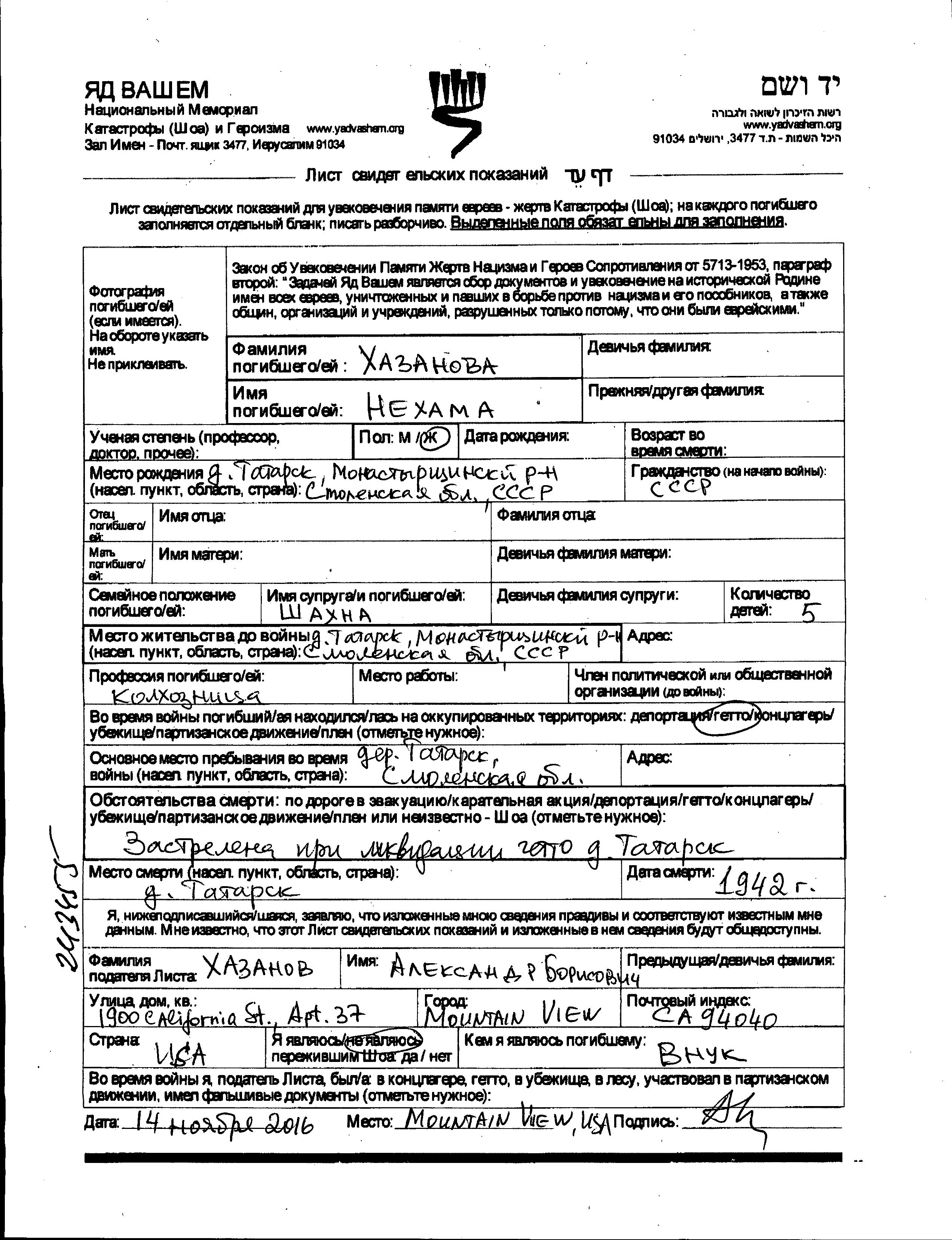 Nekhama Khazanova was born in Tatarsk, Russia (USSR). She was a kolkhoznik / kolkhoznitza and married to Shakhna. Prior to WWII she lived in Tatarsk, Russia (USSR). During the war she was in Tatarsk, Russia (USSR). Nekhama was murdered in the Shoah. Place of death: Tatarsk, Russia (USSR), 1942.