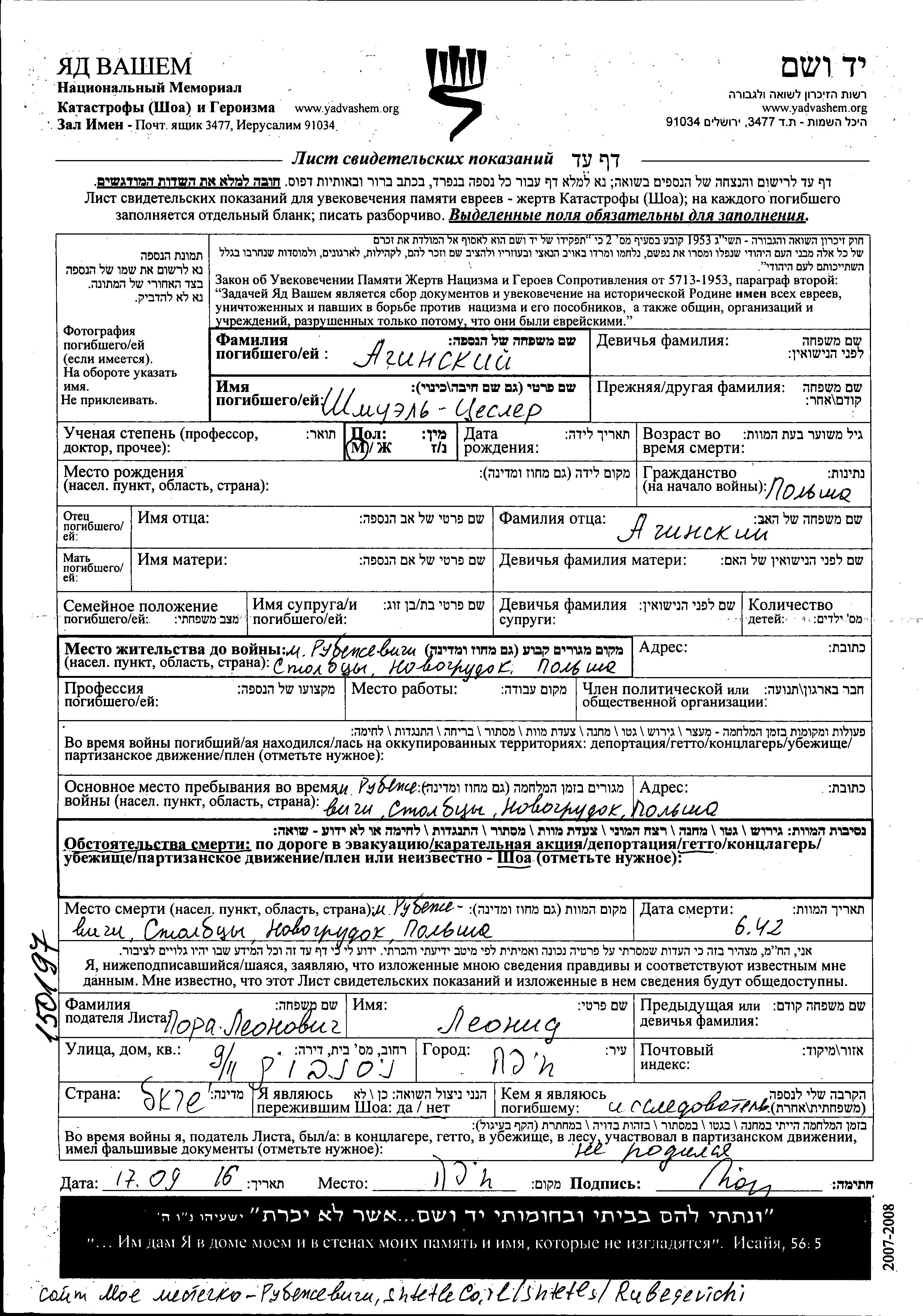 Shmuyel Aginskiy. Prior to WWII he lived in Rubezhevichi, Poland. During the war he was in Rubezhevichi, Poland. Shmuyel was murdered in the Shoah. Place of death: Rubezhevichi, Poland, 06/1942.