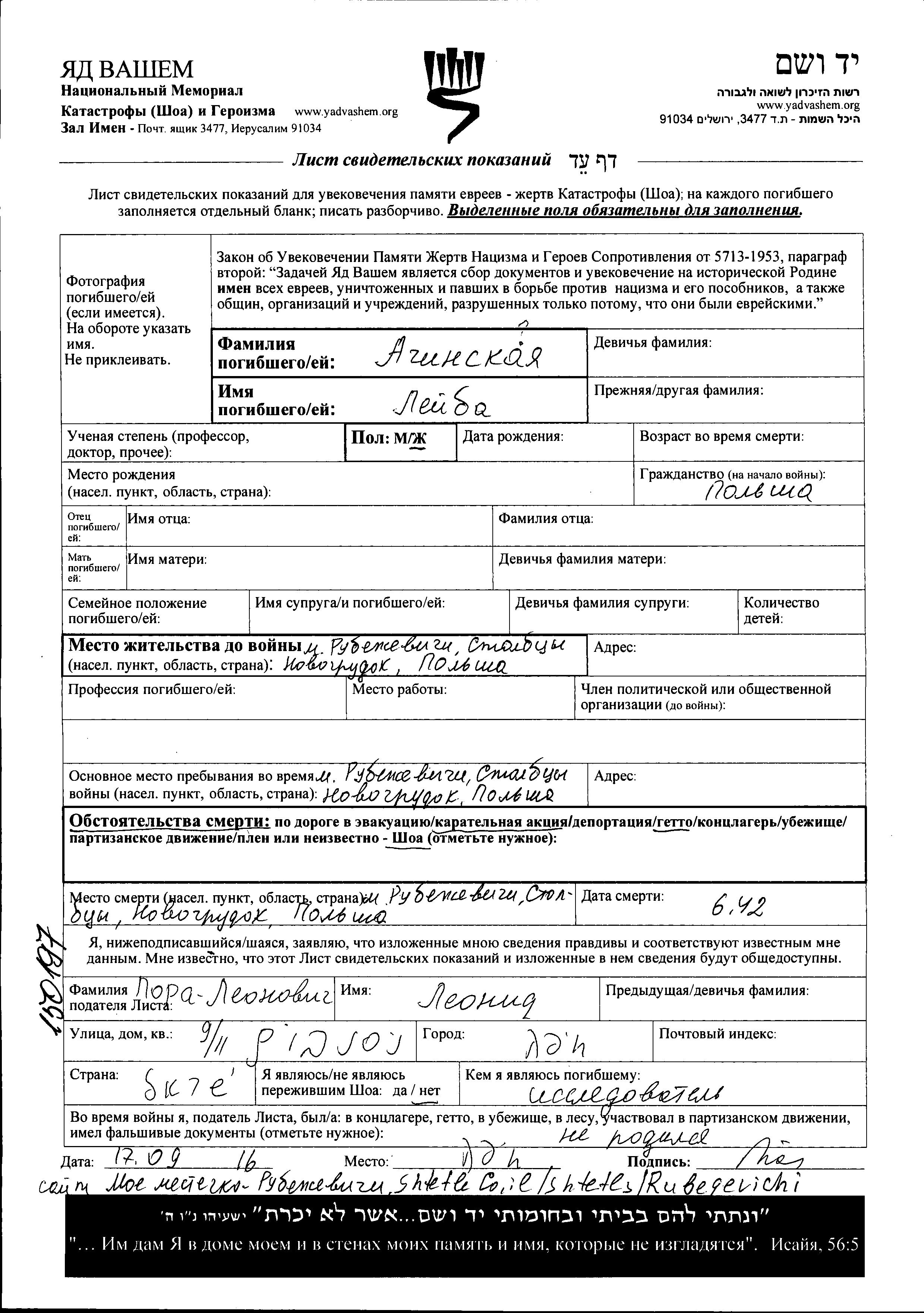Leyba Aginskaya. Prior to WWII she lived in Rubezhevichi, Poland. During the war she was in Rubezhevichi, Poland. Leyba was murdered in the Shoah. Place of death: Rubezhevichi, Poland, 06/1942.