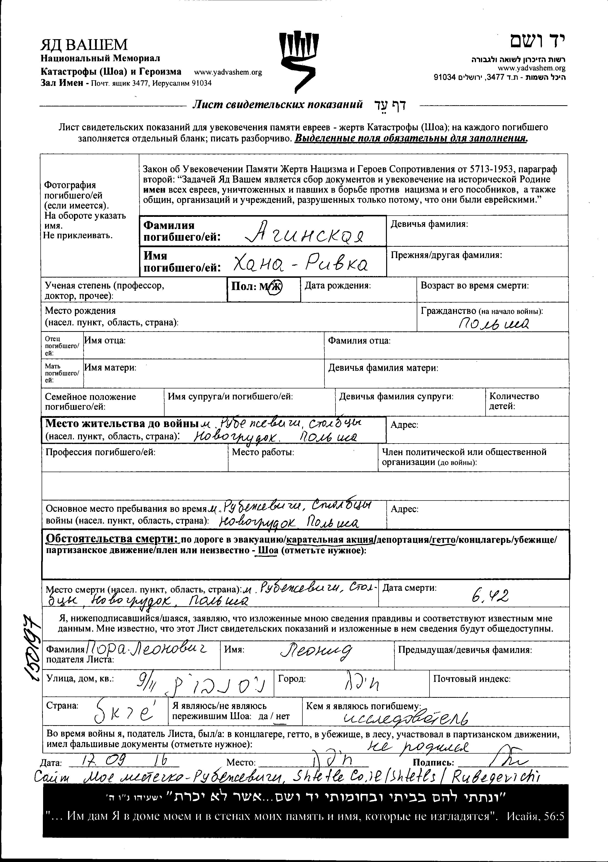 Khana Rivka Aginskaya. Prior to WWII she lived in Rubezhevichi, Poland. During the war she was in Rubezhevichi, Poland. Khana Rivka was murdered in the Shoah. Place of death: Rubezhevichi, Poland, 06/1942.