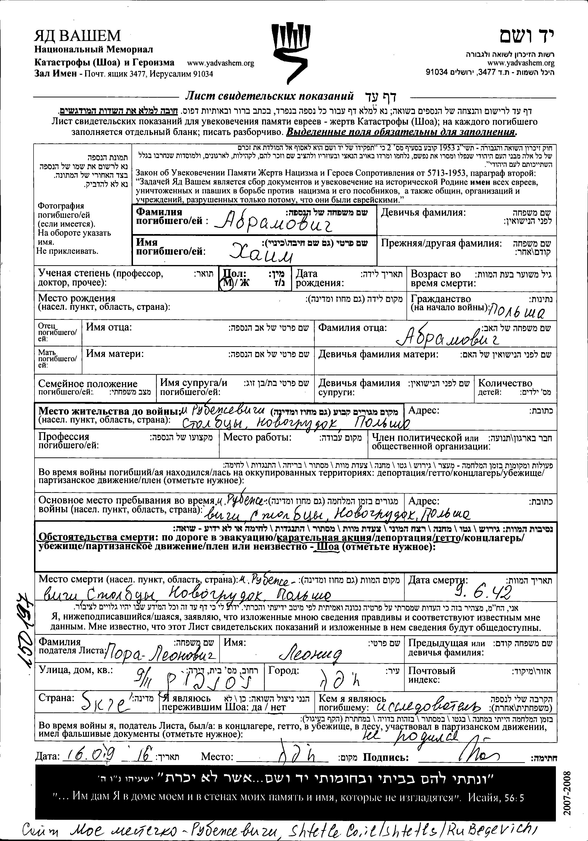 Khayim Abramovich. Prior to WWII he lived in Rubezhevichi, Poland. During the war he was in Rubezhevichi, Poland. Khayim was murdered in the Shoah. Place of death: Rubezhevichi, Poland, 09/06/1942.